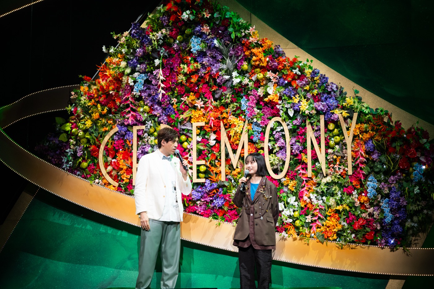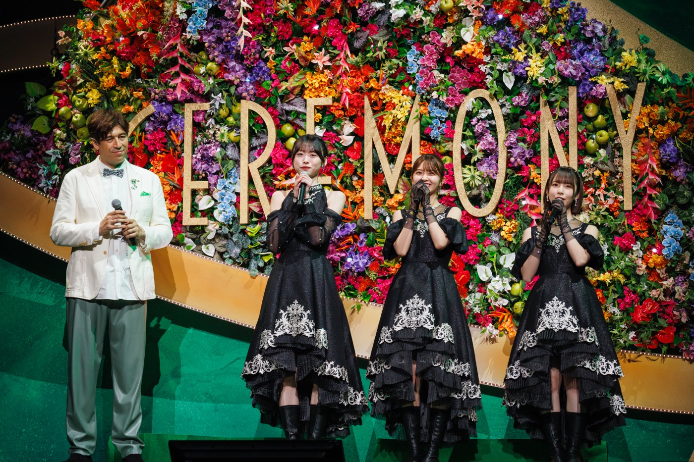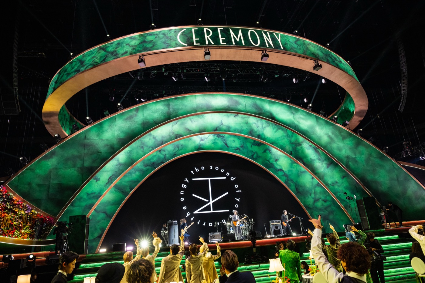 「GREEN CARPET」の高揚感も冷めやらぬなか、『CEREMONY』本編がスタート。ステージ前に設置された、円卓が並ぶアーティストラウンジに出演者が勢揃いするなか、ステージにはMrs. GREEN APPLEの大森元貴(Vo&Gu)、若井滉斗(Gu)、藤澤涼架(Key)の3人が登場して開会を宣言した。大森は「この『CEREMONY』、見るからに中央に円卓があったりとか、なかなか普段イベントで見られない光景だと思います。僕自身もいつもと違う雰囲気で高揚しています」と声を弾ませている。