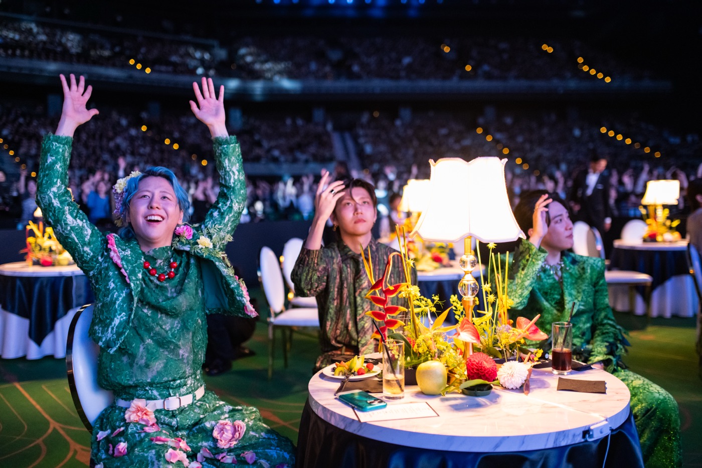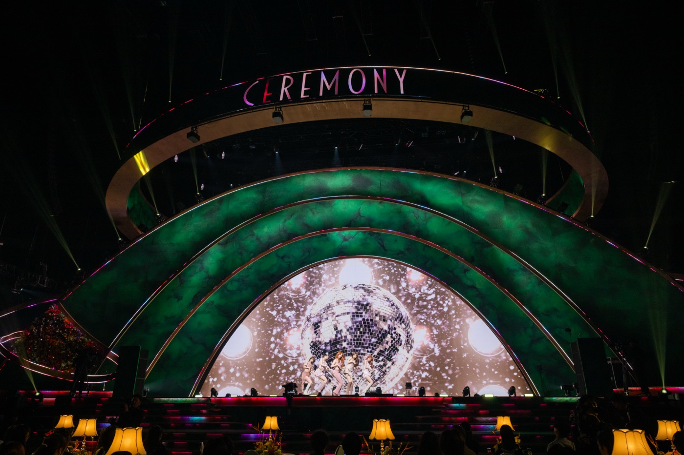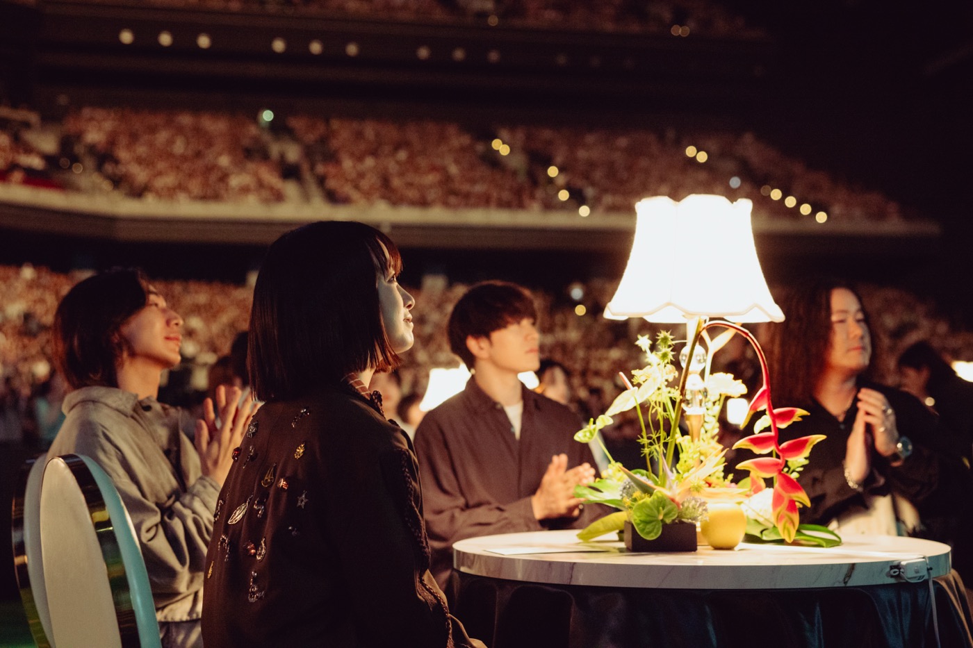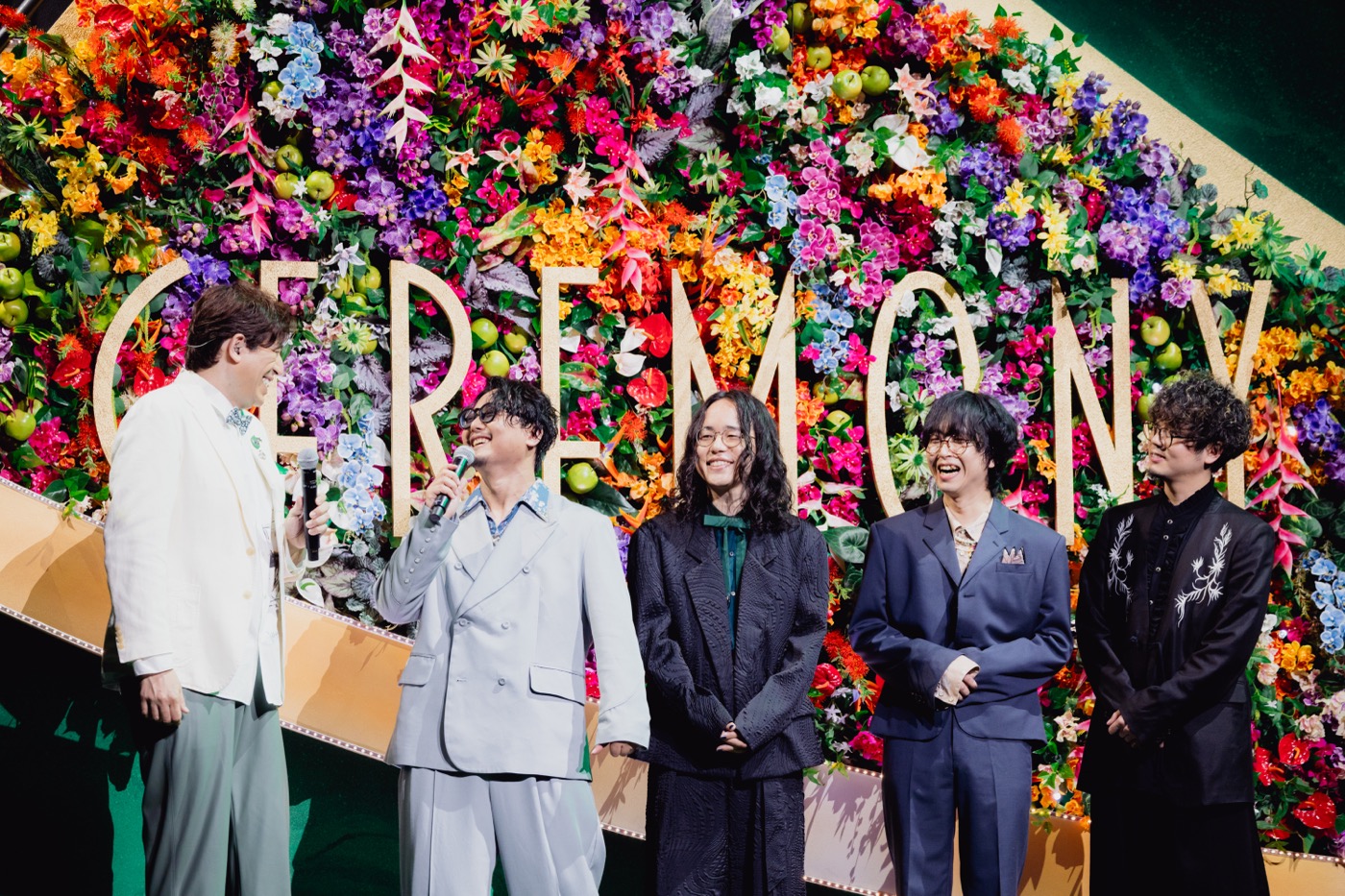 「GREEN CARPET」の高揚感も冷めやらぬなか、『CEREMONY』本編がスタート。ステージ前に設置された、円卓が並ぶアーティストラウンジに出演者が勢揃いするなか、ステージにはMrs. GREEN APPLEの大森元貴(Vo&Gu)、若井滉斗(Gu)、藤澤涼架(Key)の3人が登場して開会を宣言した。大森は「この『CEREMONY』、見るからに中央に円卓があったりとか、なかなか普段イベントで見られない光景だと思います。僕自身もいつもと違う雰囲気で高揚しています」と声を弾ませている。