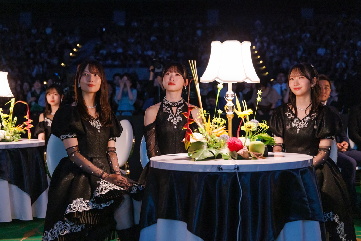 続いては「新体制でのライブを生で見るのは初めてなのでとても楽しみです!」というLESSERAFIM・SAKURAのコメントからステージに登場した日向坂46。 『CEREMONY』のコンセプトに合わせたシックな黒の衣装で繰り広げられるパフォーマンスが大きなステージに映える。「卒業写真だけが知ってる」や「君はハニーデュー」などの楽曲が次々と届けられるライブを、アーティストラウンジのMrs. GREEN APPLEのメンバーもノリノリで楽しんでいた。