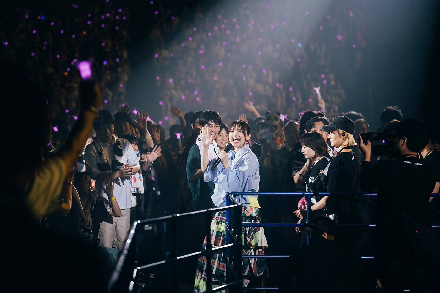 今回のツアーは「できるだけみんなの近くに行けるように」とふたりがMC中でも言うように、ファンに寄り添う様々なステージングも特徴的。センターステージに戻ったふたりは人気楽曲「ブルーバード」「うるわしきひと」を披露。最新アルバムから「うきうきぱんだ」の演奏が始まると、フロントステージのほうではサポートメンバーがパンダの着ぐるみを着て、さらに会場は賑やかな熱量に。