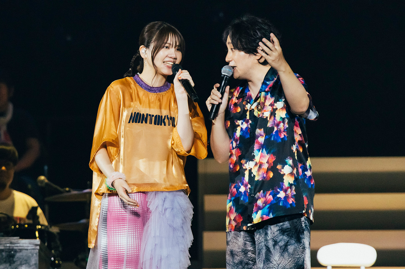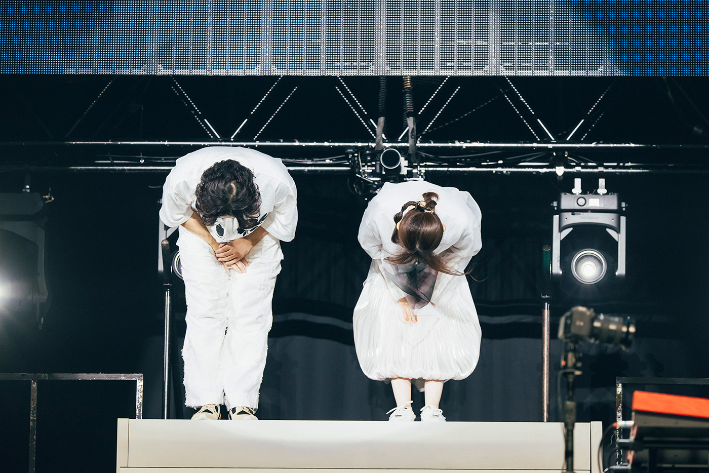 ツアーファイナル・横浜アリーナ公演には1万人のファンが集まり、開演前から会場内のブースにて賑やかな光景が。開演時間を迎えると、ステージ上のビジョンに、バックヤードで円陣を組むメンバーとサポートメンバーの姿が。毎公演楽屋で恒例となっているダジャレ円陣の様子を中継するとそのままふたりの姿をカメラが追い、ステージに登場。