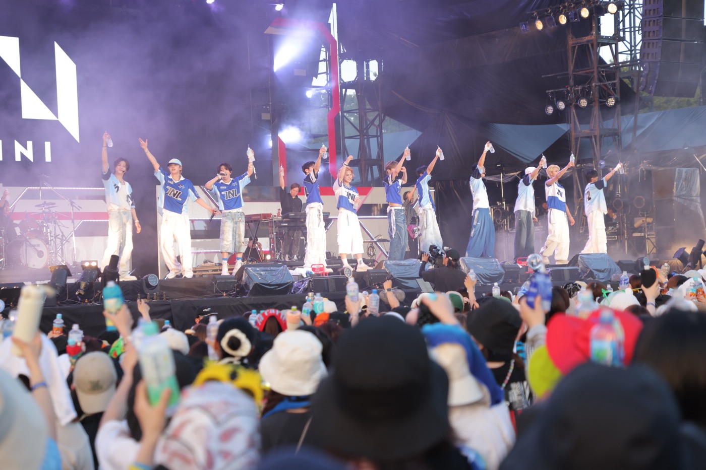 MCでは「みんなで乾杯しませんか!」とINI流の乾杯に。「ロケット発射まで3秒前、3、2、1」「ロケティー!」のコール&レスポンスで会場とステージで一緒に水分補給をするシーンも。そして空には綺麗な夕焼けが広がり始め、「この時間にぴったりの曲」と「Runaway」へ。続いての「Pineapple Juice」は、メンバーの許豊凡が作詞に参加、木村柾哉、田島将吾、西洸人が振り付けを担当したサマーソングで、イントロから会場のレスポンスもアップ。ノリノリの「Party Goes On」に続いての「WMDA (Where My Drums At)」、そしてラストチューン「BOMBARDA」では、ステージを炎や火花が彩る演出も。オーディエンスもステージに負けないパワフルさで、最後まで声援を送っていた。