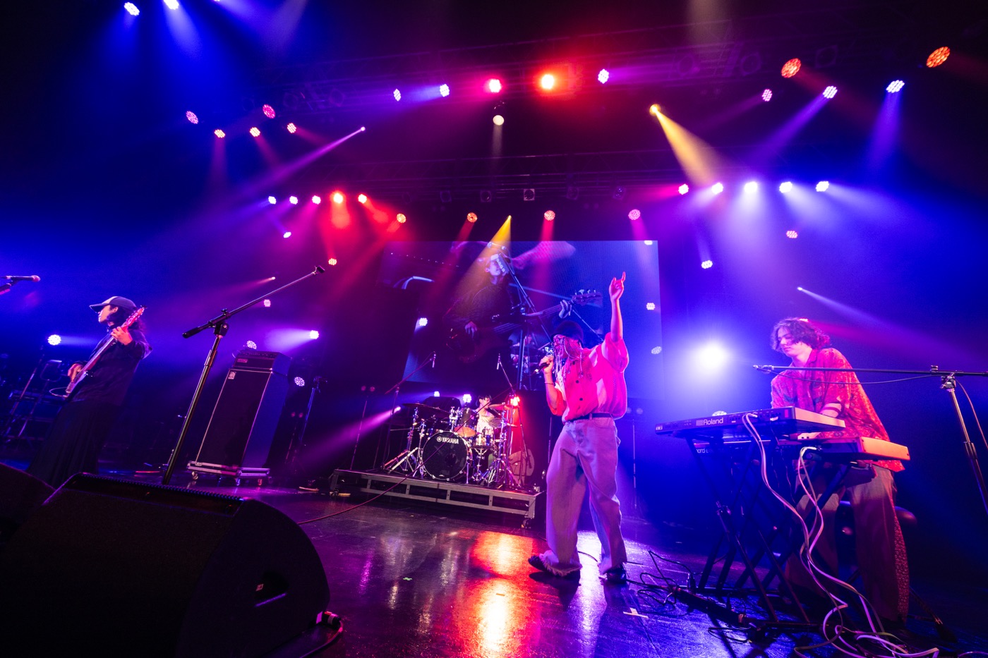 東京発グッドヴァイブスミュージックこと、PRE が登場。青柳創太のソロプロジェクトで、今回は“PRE (with my friends)”と銘打ってのバンド形態での出演となった。最初に披露したのは「八月の電車」。落ち着いた8ビートで始まったかと思えば、サビでのテンポアップ、ラストの変拍子など、高い楽曲センスを感じさせた。続いて浮遊感のあるイントロから始まり重厚なグルーヴへと繋がっていくミディアムロックナンバー「空中」を披露。「みんなと踊りたいんですよ。楽しいから。ほんと言いたいことはそのくらいかな。楽しんで帰ってください!」と伝え、最後に爽やかなロックナンバー「さよならを云わせて」を披露。踊るようなステージパフォーマンスで会場を盛り上げた。