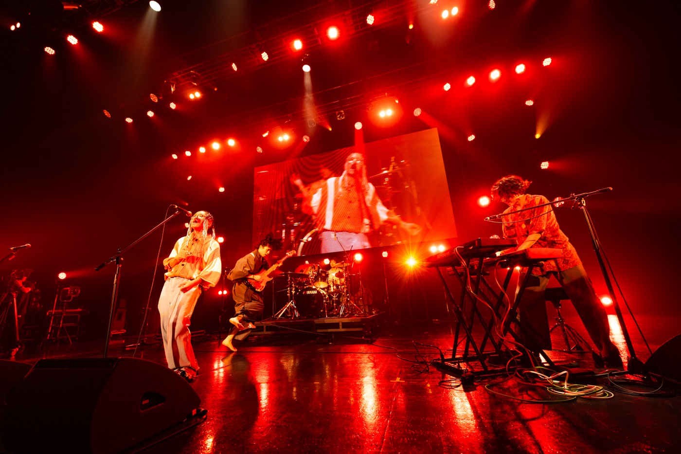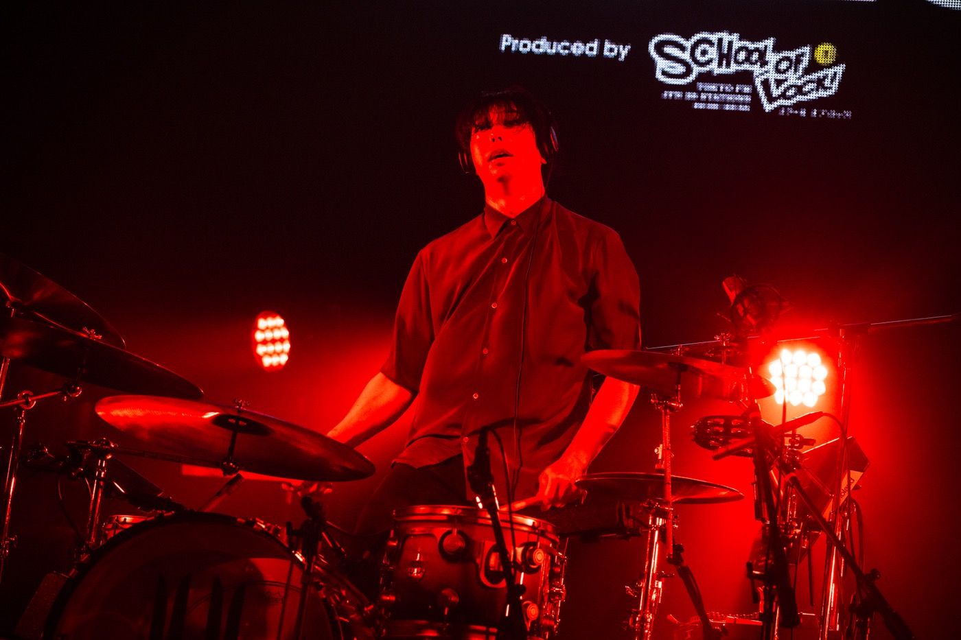 メンバーがステージに登場すると、会場からはいっそう大きな歓声が上がりました。「今日は長丁場お疲れ様でした。9パターンの”命がけ”をくらって僕も胸がいっぱいなんですけど、ここからは大の大人が一生懸命ライブをやるのを見ていただく時間です。よろしくお願いします!」と話し、ライブがスタート。「傍若のカリスマ」「オリオンをなぞる」を続けて披露し、会場のボルテージを一気に上げた。続けて「場違いハミングバード」「カオスが極まる」も披露。聴く人々の腹の底にも鳴り響くような音の数々が、会場の熱も相まって、会場の Zepp DiverCity全体を一体感で包んだ。