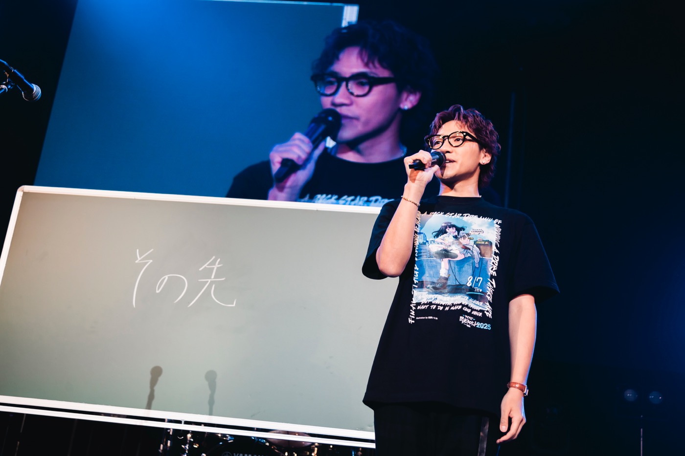 「このマイナビ閃光ライオットというのは、オーディションでもなければ、グランプリを獲ったからといってデビューできるものではありません。ただ、今この瞬間に、グランプリを獲得した、獲得できなかった、そういう光と影の境界線がくっきりと引かれました。画面やステージという境界線で、届ける側、受け取る側という、沢山の人が閃光ライオットに関わっています。その閃光ライオットに関わって、光を感じた生徒もいると思います。その光が自信になって明日から頑張ろうって思った生徒がいると思う。ただ、逆も然り。なんで自分はこうなんだろうって、こんな自分は嫌だなって、影を感じた生徒もいるかもしれない。ただ、どんな状態の君も、全員共通していることがあって、平等に明日が来るということ。一生懸命明日を生きましょう。マイナビ閃光ライオット2025は、これですべて終わります。でも僕たちはまだ終わっていません。ファイナリストのみんなが、音で、みんなに届けた勇気を、それを受け取った僕たちの覚悟を、なかったことにしないために、明日を一生懸命生きましょう。時間がかかるかもしれない。でもいつか絶対に、つま先のその先に一歩を踏み出せるように、次こそは自分の世界がひっくり返ると信じて、全力で生きましょう。瞬きしたくなるような、眩しい閃光の先で、必ず会いましょう!」