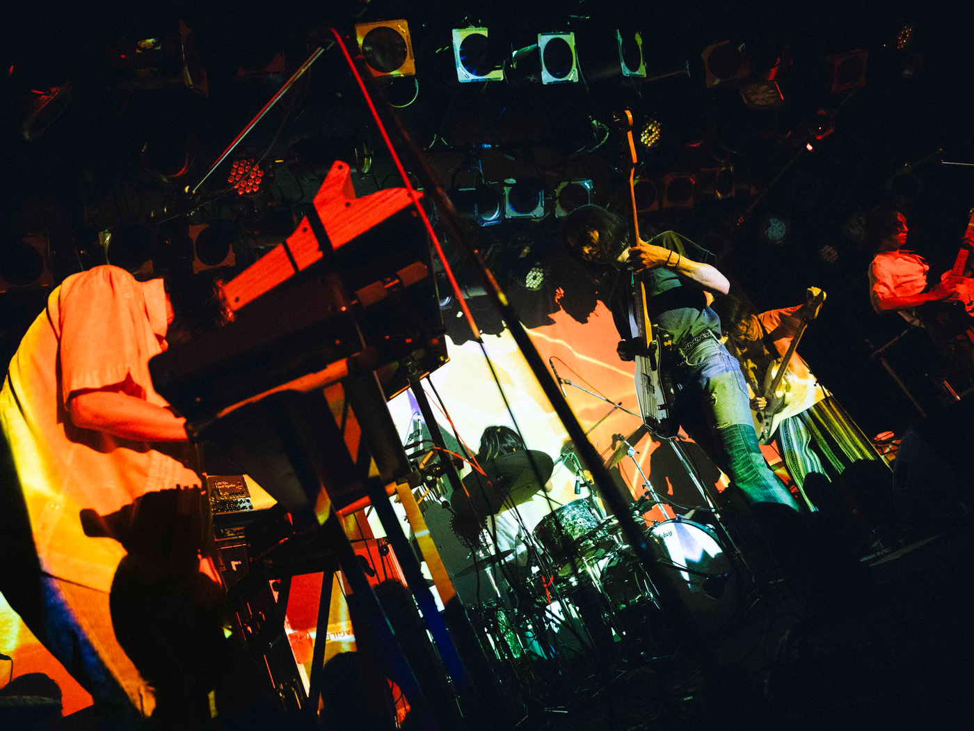 5人がバラバラに楽器を鳴らすなかで自然と音が集約して曲が始まったり、曲と曲をシームレスにつなげたり、「曲」の枠組みすらもなくすような60分。バンド内の約束ごとをなくして音階やリズムからも解放された「不規則性」と、フレーズがループすることでダイナミックスや熱量を高めていく「規則性」、その両方によって意識と無意識にアプローチする演奏が続いた。
