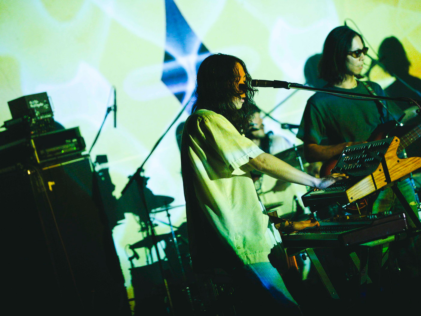中盤は、EP『doyes』より1曲目から3曲目までを収録順どおりに披露した。船の出航を彷彿とさせるイラストがスクリーンに投影される中で「Fune」から始まり、現実と夢想のあわいを浮かび上がらせたかと思えば、シンセサイザーの音を止めないままタンバリンなども重ねて「DAO」へ。リズムのない時間から、一定のリズムとリフがループするタームに入ると、自分のなかの眠っている感覚を呼び起こしてじわじわと覚醒させてくれるよう。