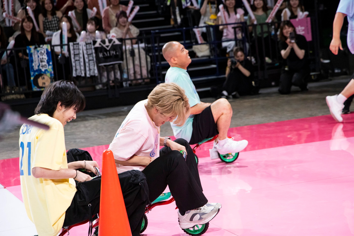 最後の種目は自転車でいちばん遅くゴールした人が勝利となる「自転車遅こぎ15m競争」。1回戦は中島、八木、RIKU、吉野のボーカル対決となったが、中島が八木を巻き込む形で倒れ込み、両者は失格に。1位は吉野、2位はRIKUとなった。