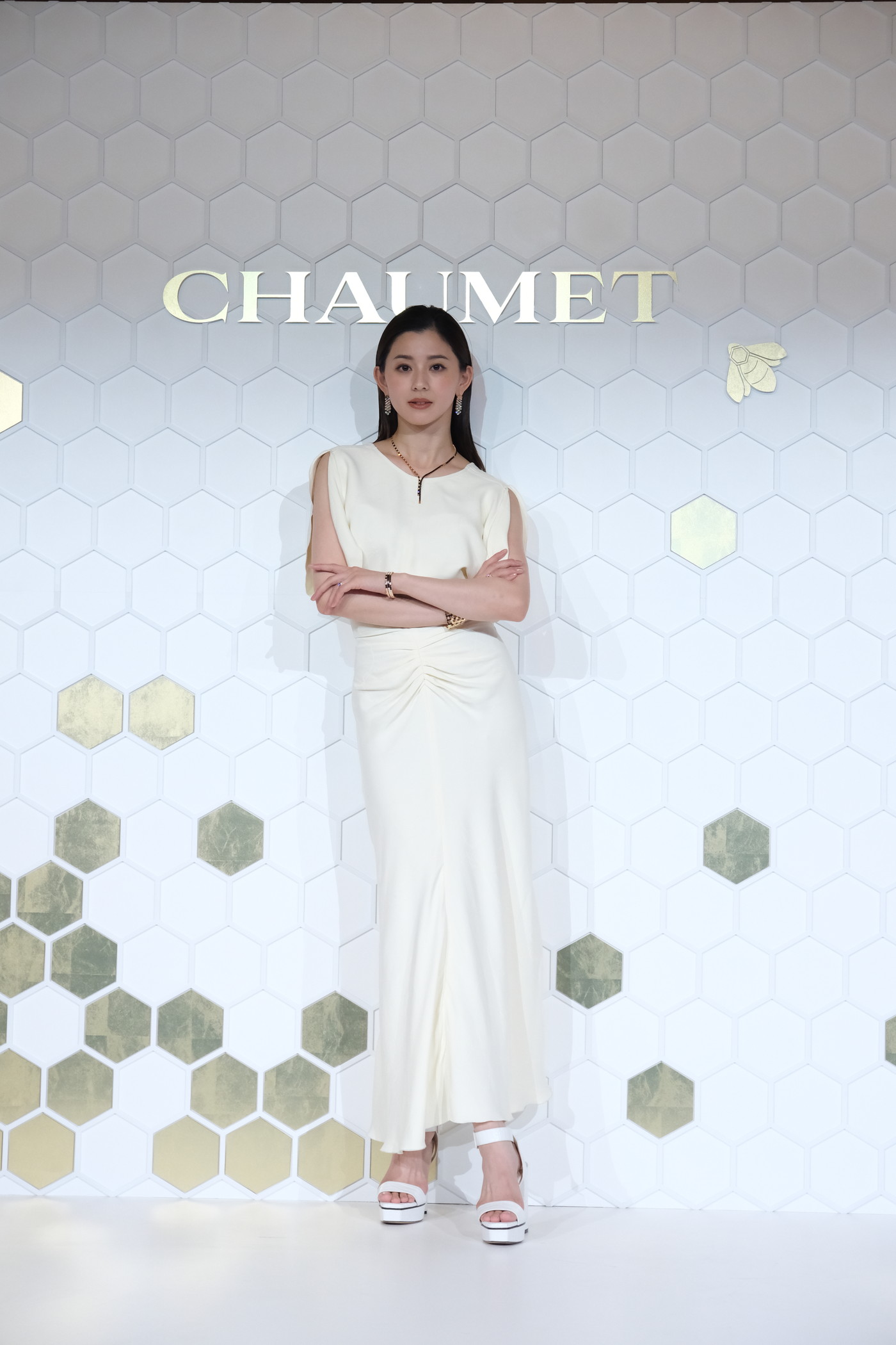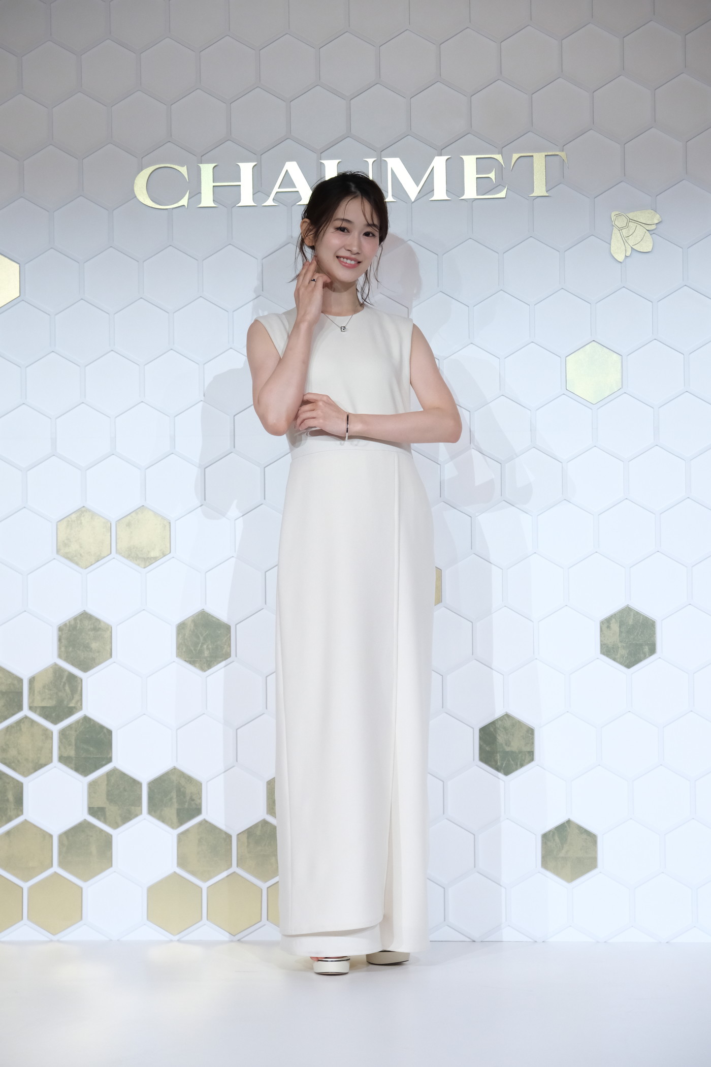 朝比奈彩は、二の腕部分にスリットの入った白いドレス姿で登場。エキシビション『ショーメ、自然美への賛歌』を体験した感想を聞かれると、「ショーメの245年の長い歴史を体感できる展示になっています。ショーメの伝統や歴史が感じられるので、そういうところを皆さんにも見ていただけたら嬉しいです」と明かした。