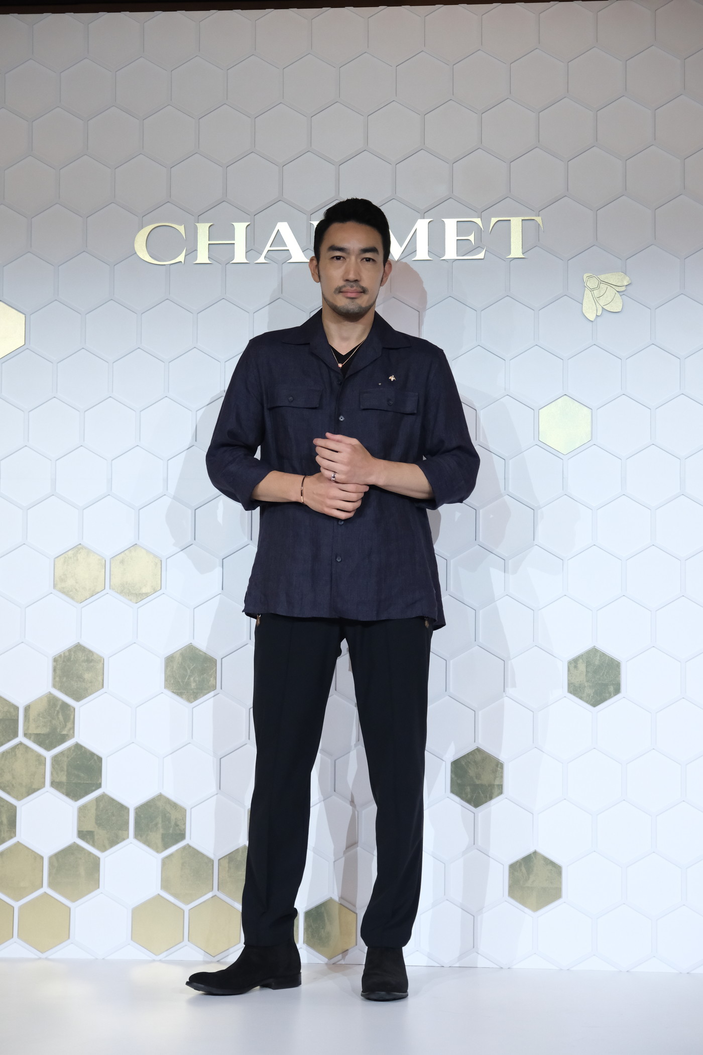 大谷亮平は、ブラックのシャツをジュエリーに合わせ登場。エキシビション『ショーメ、自然美への賛歌』を体験した感想を聞かれると、「神秘的な場所で酷暑を忘れさせてくれる居心地の良い空間でした」と話した。