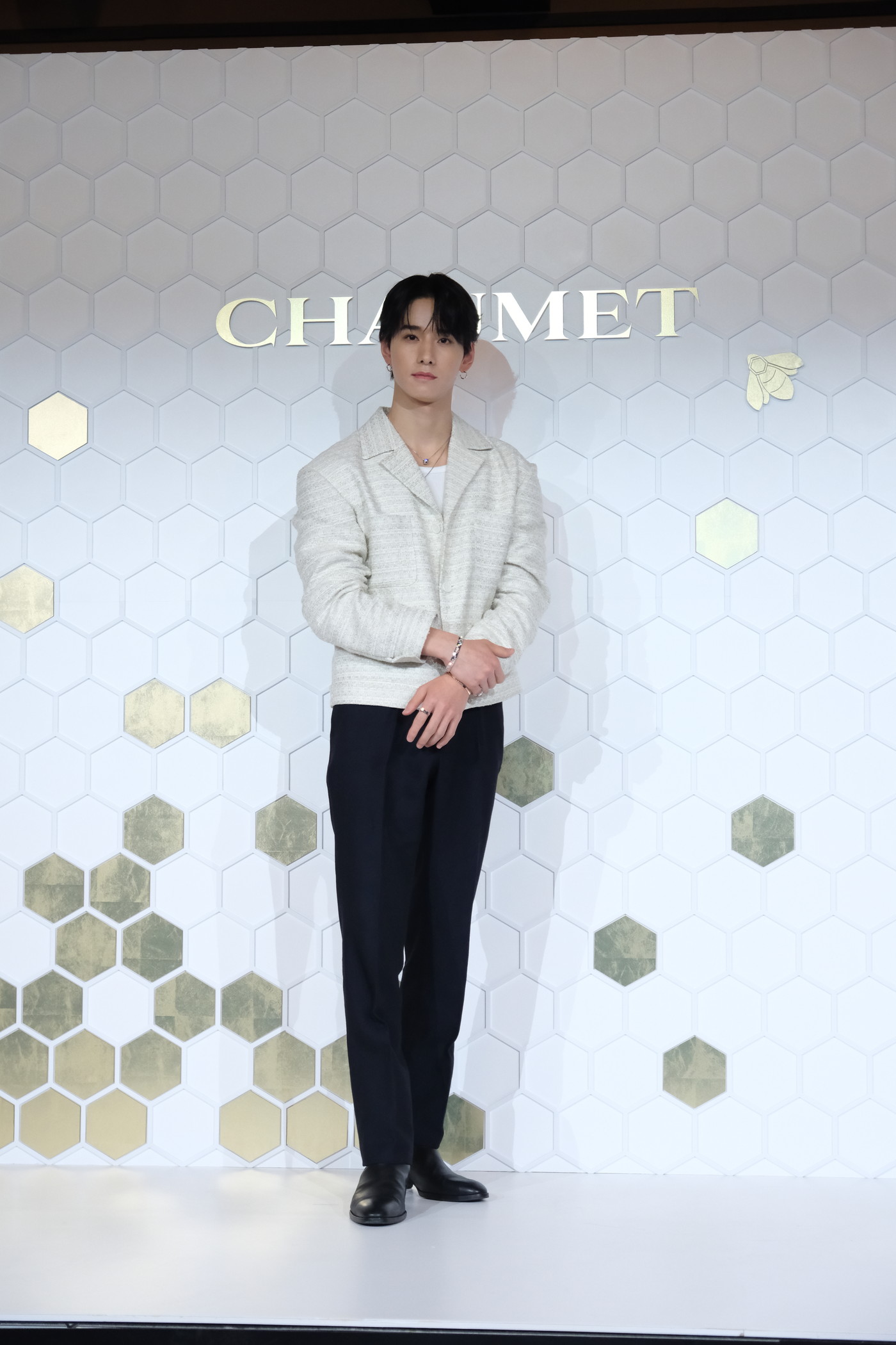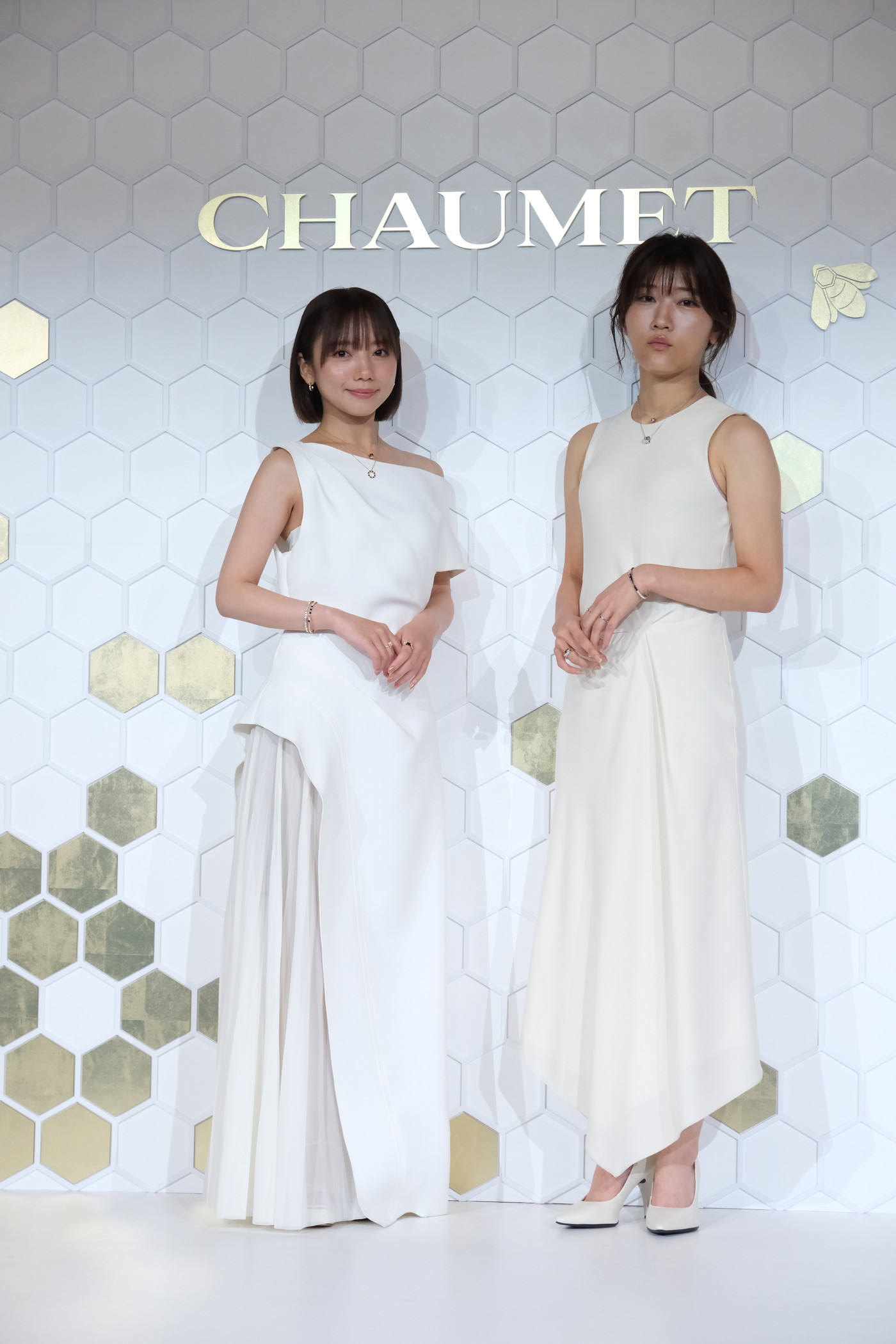 NiziUのRIMAは、美脚をスラっと出したミニドレスで登場。ショーメの「自然への愛」というテーマにちなみ、自身が赤い糸で結ばれ、愛を感じるものを聞かれると、「パッと思いつくのが“音”。音楽もそうですし、普段の生活音や自然音がヒーリングになっているので、私が愛しているのは“音”かなと思います」と話した。