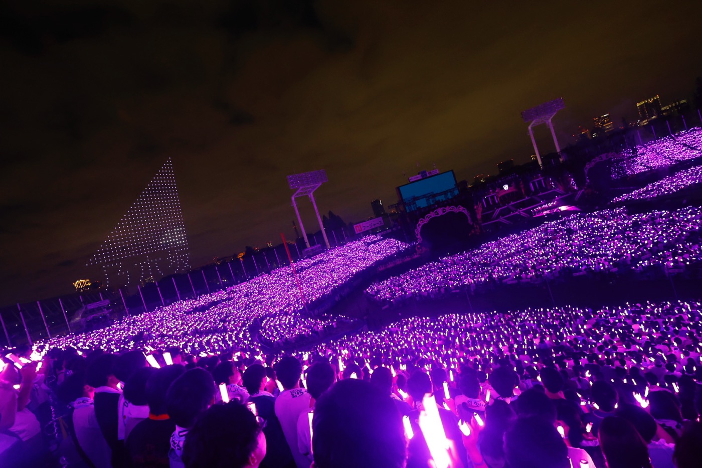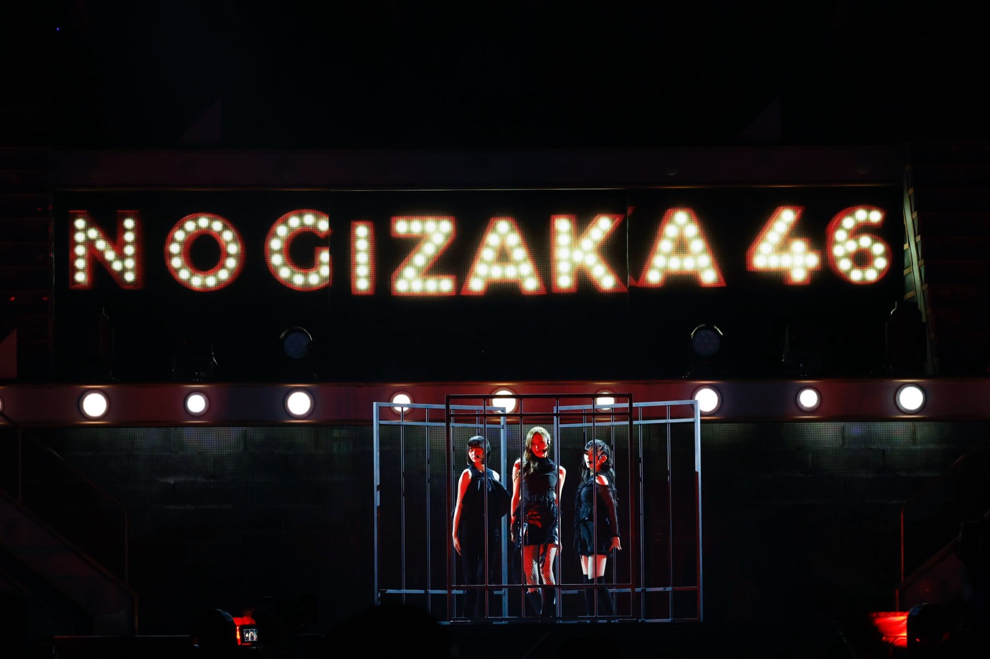 そして梅澤が、全力を出し切って声を枯らしている賀喜に労いの言葉を送り抱擁を交わすと、再び会場上空でドローンが乃木坂46のロゴを描くなかで「乃木坂の詩」を披露して、会場全体が乃木坂46カラーの紫で染まるなか、ライブはエンディングを迎えた。