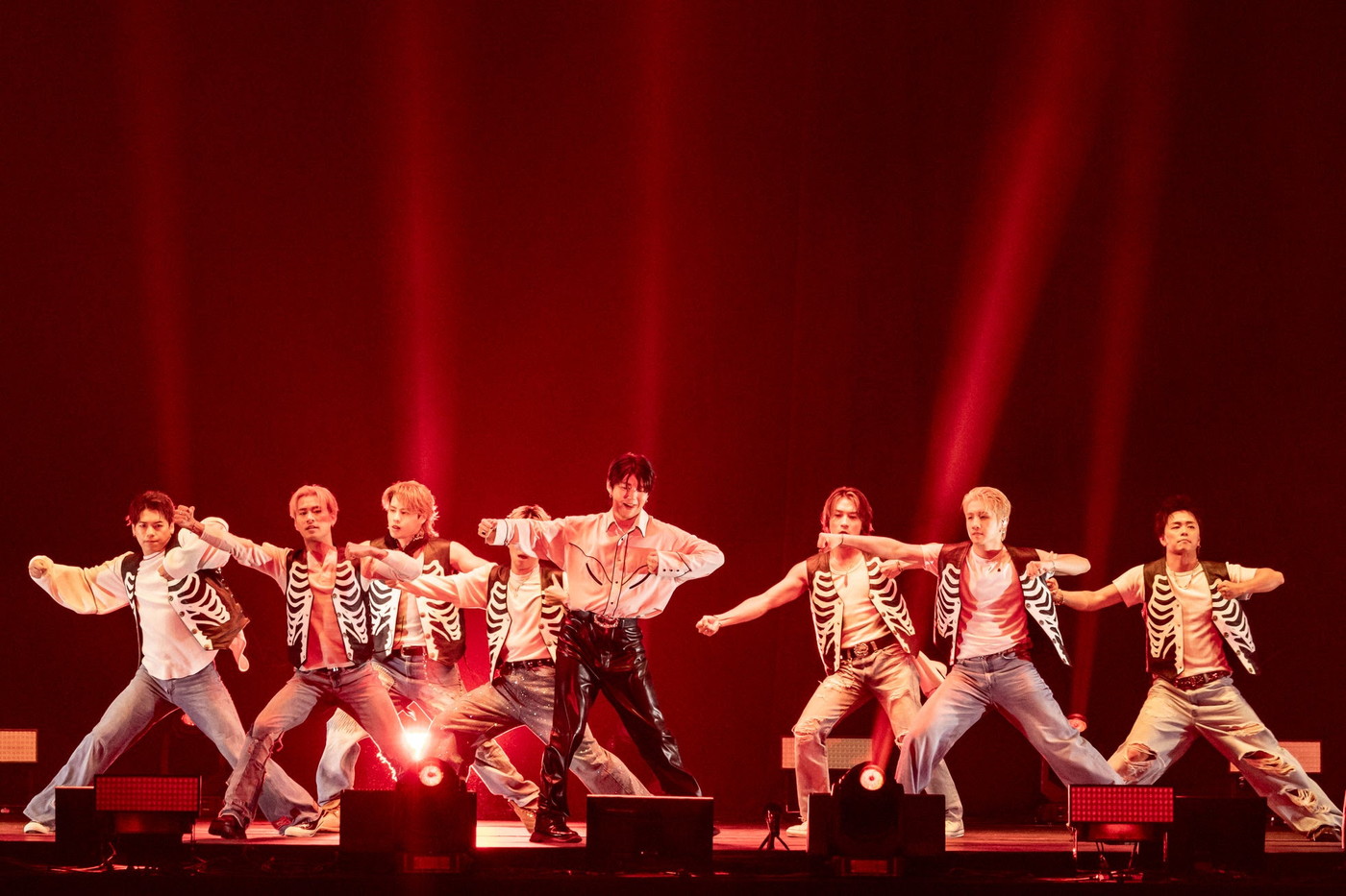 ライブパートのトップバッターはBALLISTIK BOYZ。おそろいのボーン模様のベストで揃えた7人は、「Stardust Forever」でさわやかなエネルギーを放って、ライブの火蓋を切って落とす。