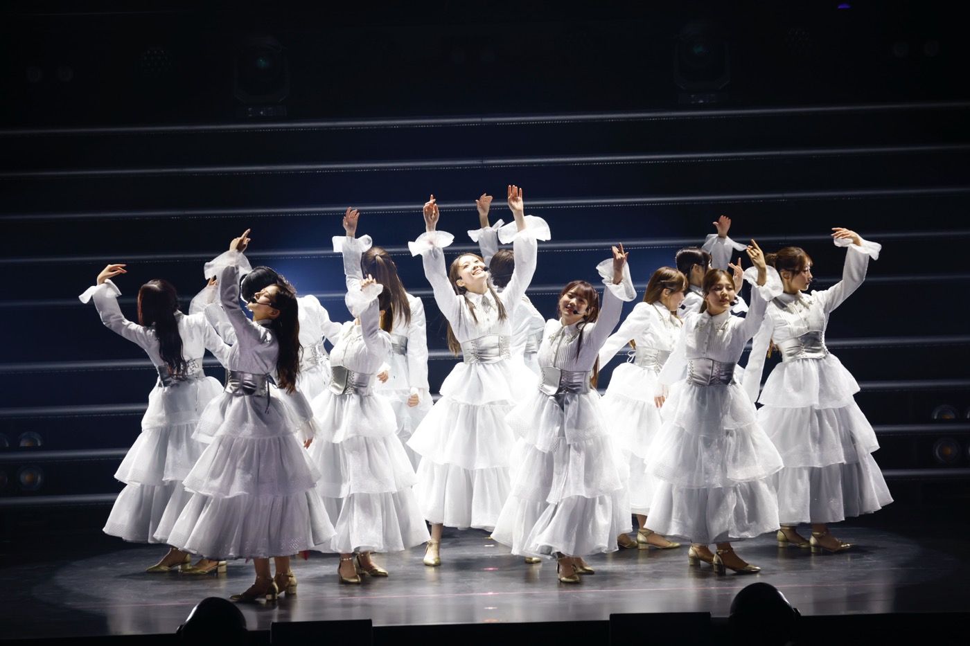 情熱的な楽曲に合わせて、メンバーは力強さとしなやかさを織り交ぜたダンスで観客を魅了。その後も12人の配列で「4」や「6」を作り出す「My rule」、ミラーボールの眩い光が幻想的な空間を作り上げる「Hard to say」、雨が打ちつける中でキラキラと輝く電飾の映像が印象的な「マシンガンレイン」と、曲を重ねるごとに客席のボルテージも一気に上昇していった。