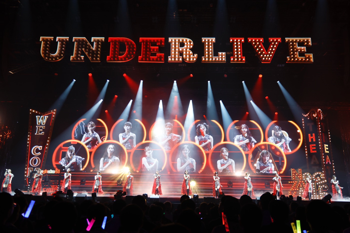 正面に「UNDERLIVE」、両サイドに「WELCOME」や「THEATER」「Effort, Thanks, Smile(努力、感謝、笑顔)」「NOGIZAKA46」の電飾が施された、海外の劇場を思わせるステージセット上に、林瑠奈を筆頭にひとりずつメンバーが登場。最後に金川が姿を現し、「今日は限界突破するぞ! みんな、いっぱい声出してね」を合図にステージ後方の赤い幕が開き、ライブは「Under’s Love」にて華やかに幕開けを飾る。