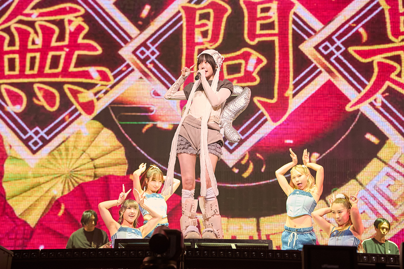 anoは背中の装飾が特徴的な衣装で登場し、「anoで~す!楽しんでいこう!よろしゅう!」「今日この時間は自由なので、楽しんで帰っていってね!」と序盤から「anoワールド」全開。一度聴いたら頭から離れなくなる大ヒット曲「ちゅ、多様性。」でスタート。会場はどんどんano色に染まり、指揮者のような振り付けに合わせて会場が青いペンライトを振り一体感に包まれた「スマイルあげない」、メタル調のギターサウンドにanoのプリティボイスとシャウトの振り幅が衝撃的な「Bubble Me Face」を次々と披露。MCでは「コチコチコチコチ♪ご馳走だ♪」という、anoさんが出演した「コカ・コーラ」のCMの一節を再現。「普変」「KILL LOVE」ではギター演奏を披露。「ぼく、こんなペンライトの灯りの中で演奏するの久々。え、みんな支給されたの?違う?聞こえないけど、とにかく楽しいです!」と話すシーンも。「骨バキ☆ゆうぐれダイアリー」ではイントロからアウトロまで力強いデスボイスを響かせ、会場のボルテージも最高潮に。ラストの「絶絶絶絶対聖域」では、ステージ上を練り歩きながらひとりで歌唱。anoは最後に「ありがとうございましたー!」とロングトーンで絶叫し、「最後まで楽しんでいってね!バイバ~イ!」と軽やかにステージを後にした。