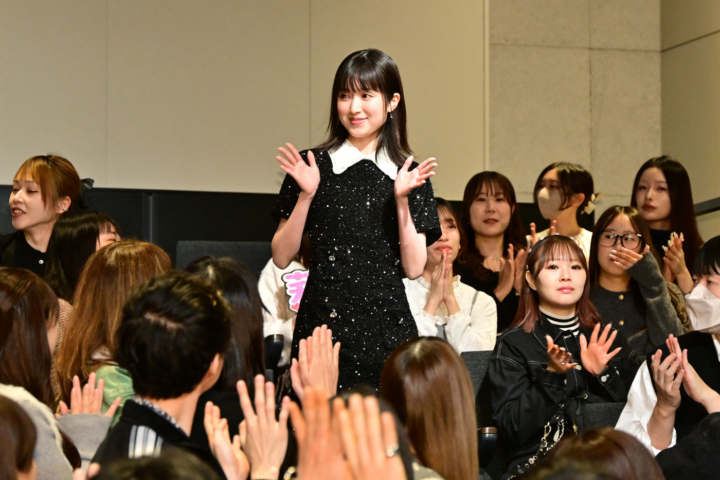 客席通路からの登壇に早速大きな歓声が上がるなか、舞台挨拶がスタート。まずは、福本演じる仁菜子と高橋演じる蓮の“想い”が動き出した第1話と第2話から、お気に入りのシーンについてトークを展開。福本が「たくさんあるんですけど、やっぱり電車のシーン。ふたりが出会う場所でもあるし、物語が進むにつれても電車のシーンは印象的な場面が多いんです」と振り返りる。