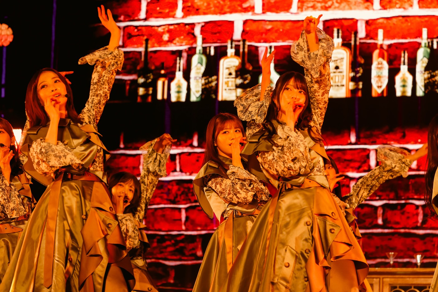 続く「ノンアルコール」ではバーカウンターをイメージしたセットを背景に、大人びた空気を漂わせながら歌い踊る。曲中、カクテルグラスを片手にした武元唯衣が大沼晶保、中嶋優月とストーリー性を感じさせる絡みを見せる場面も。「愛し合いなさい」では増本綺良を中心に、アイドル性の強いキラキラしたダンスでオーディエンスの目を奪った。