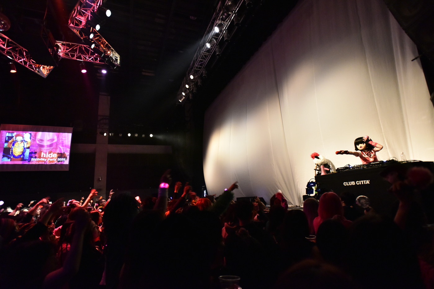 INAの誕生日を祝ったあと、hideへのバースデーソングをみんなで歌い、DJタイムが始まった。DJブースの中にとどまらず、マイクを持ってステージをあちこち動いて、オーディエンスを巻き込んでいくINA。「FISH SCRATCH FEVER」では、「DIEちゃんがこの曲をやりたいっていうのでデータをあげたりしてたんだけど、できなくなっちゃったから応援メッセージを送りたいと思います」とスマホでオーディエンスと一緒にメッセージを撮影。この動画には、緊急入院でイベントに出演できなかったDIEも喜んだことだろう。