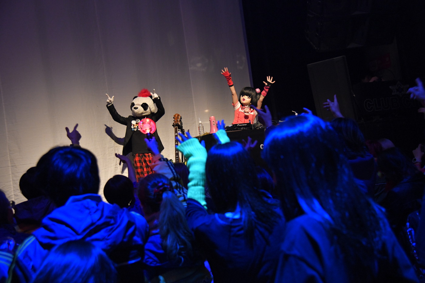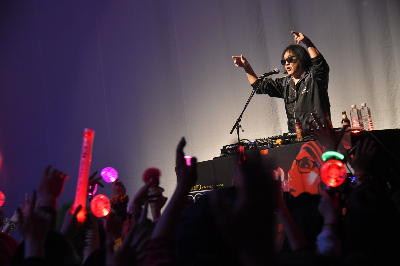 開場時間になると、ステージ上のDJブースに桃知みなみが登場。まだ誰もいないがらんとした客席に向けて、DJを始める。そこへひとり、またひとりと、来場者が走り込んでくる。「おはよう」「いらっしゃい」と手を振りながら、声をかける桃知。良き相棒のパンザブロウもステージに登場して、これから始まるイベントを一緒に楽しむ仲間たちをhideの音楽で温かく迎え入れているのが微笑ましい。徐々に客席がオーディエンスで埋まっていき、DJタイムが終わる頃には会場はほぼ満員になっていた。