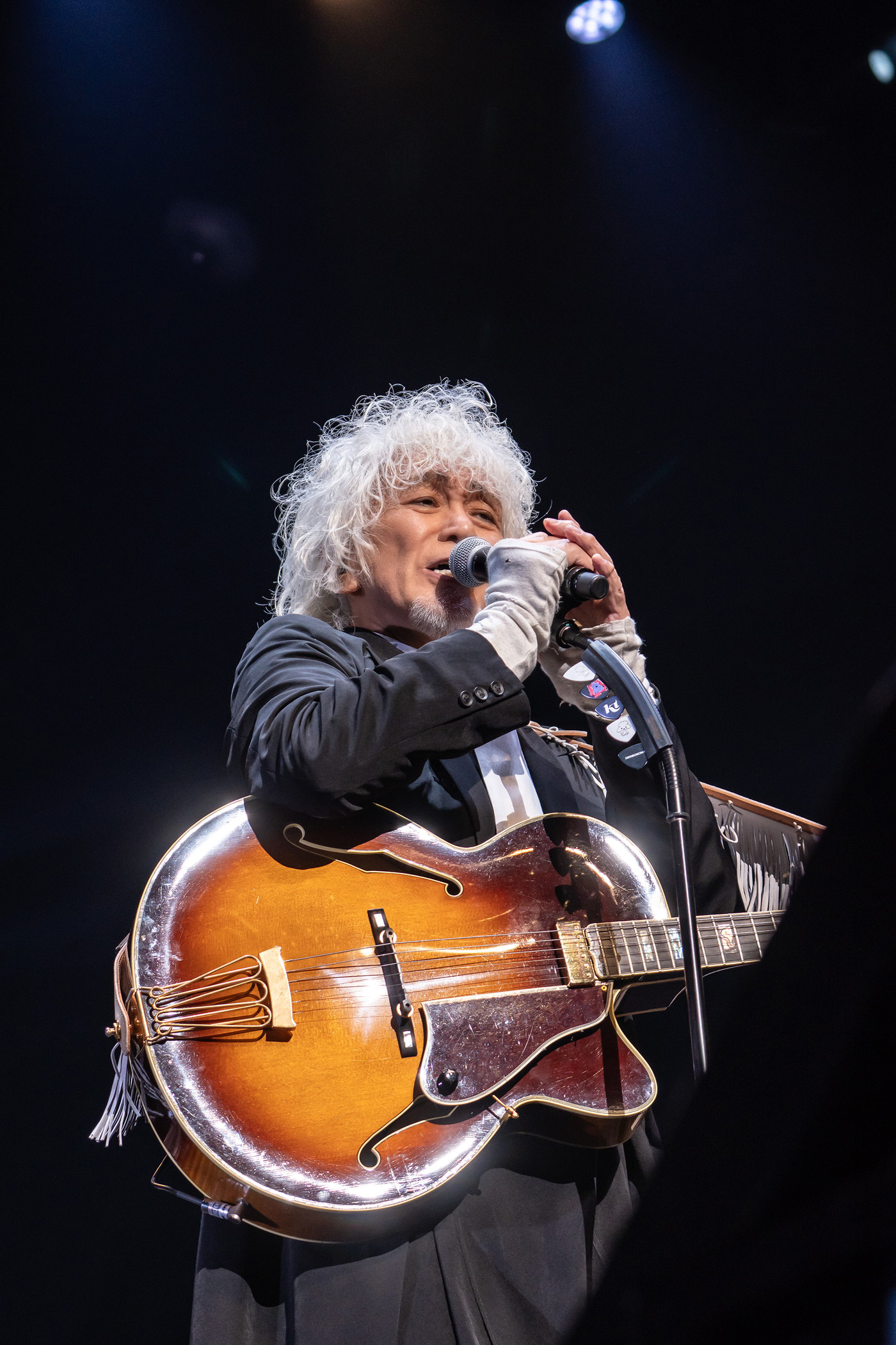 舞台中央に置かれていた青いバスカリーノを手にし、歌い始めたのは「青い“なす畑”」だ。大切な家、花咲くふるさと。柔らかな歌声が、聴衆を記憶の中にある故郷へと導いていく。8人の弦楽器隊と門田 “JAW”晃介と武嶋聡のサクソフォーンによる前奏に続いたのは、アップテンポな「からっぽの心で」だ。悩んで疲れても、歩き続けて空を見上げようというメッセージを歌う。慈しむような眼差しで聴き手ひとり一人を見つめるその表情はとても優しい。