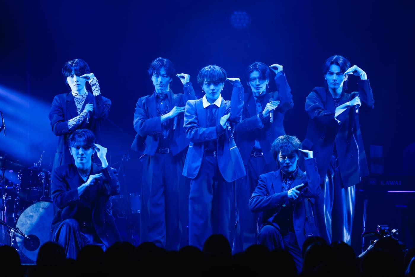 ベルと鐘が鳴る冬ムード満点のSEからステージを覆っていた紗幕が左右に開き、背景のステンドグラスに雪が舞う荘厳なムードのなか7人が贈ったオープニング曲は「アビスと清らな銀世界」。昨年12月に行われたクリスマスライブのために作られたナンバーを、スモークが立ち込めるステージで1年ぶりに披露すれば、客席を埋めつくす観測者は推しのメンバーカラーのペンライトを掲げて、場内にカラフルな光を投げかけていく。ファンタジックな世界観を広げながらも、リーダーの吉澤要人は“Happy Holidays”と地に響く低音でささやき、人形のように無機質なムーブも取り入れてミステリアスな空気感を流し込んでいくあたり、まさにゲンジブ流クリスマスソングといったところ。ツイードジャケットに白いブラウスのモノトーンスタイルに、イヤリングやネックレス等のアクセサリーを着けたフォーマルなビジュアルも、今の時期ならではのスペシャルなもので、続く「キミヲナクシテ」をセンチメンタルかつ上品に届けていく。