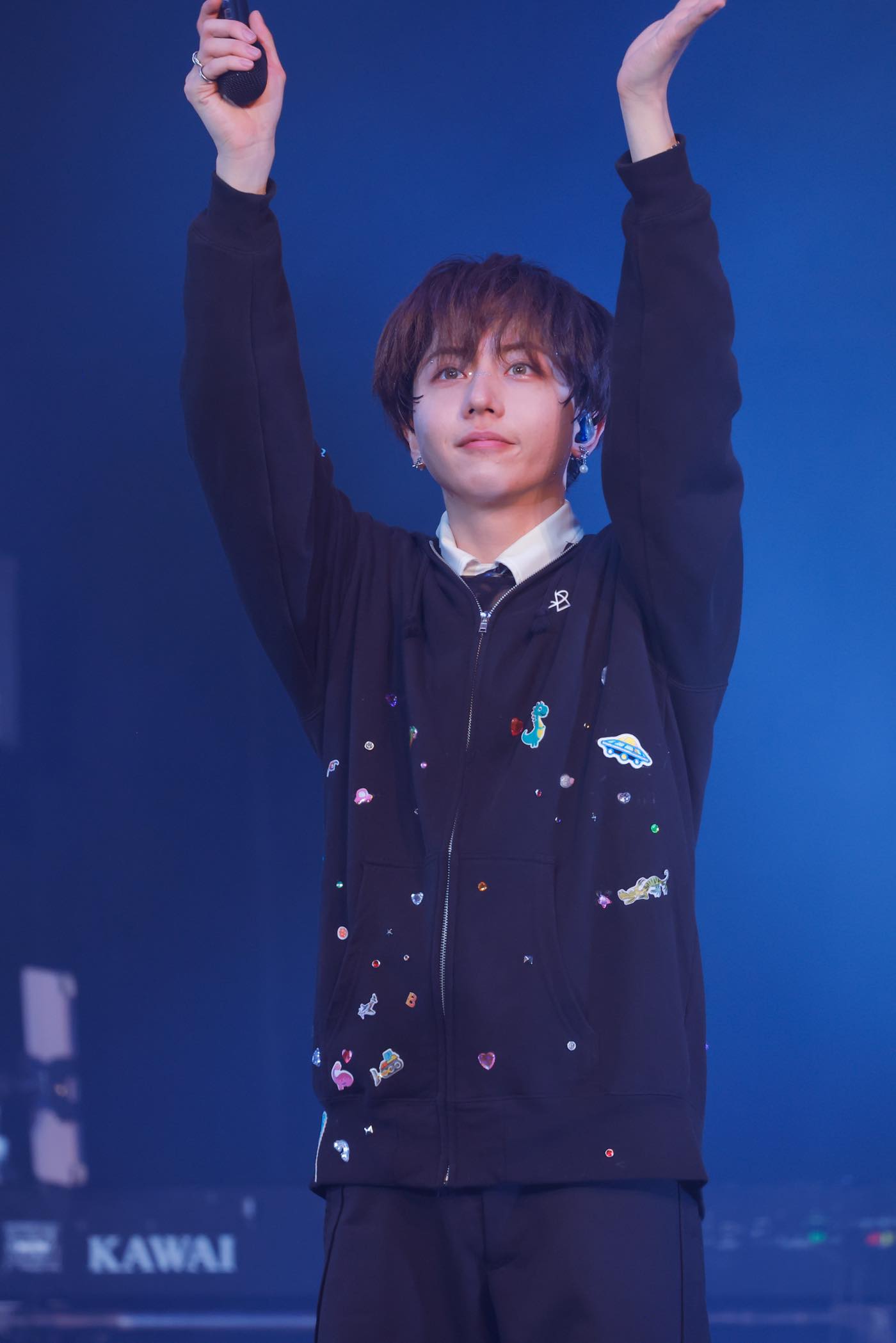 さらに実験は続き、バンドメンバー紹介を兼ねたインストから、黒メインのジャケットスタイルに着替えた7人が登場して「因果応報アンチノミー」へ。印象的な舌打ちと小気味よいタットダンスがSNSでも話題になり、MVが270万回再生を記録したナンバーを、生のピアノ演奏やスラップベースの重低音で奏でる贅沢なアレンジで聞かせていく。最終公演では杢代が「大好き」、桜木が「来年も会おうな!」と歌い替え、大倉もラップを荒々しく叩きつけて場内の盛り上がりはクライマックスへ。その場の空気によって音もタイミングも変わるバンドの生演奏が7人に普段とは違うエナジーを注ぎ込んでいるのは明らかで、その相乗効果は“実験室”と名付けられた今ツアーの大きな成果だ。