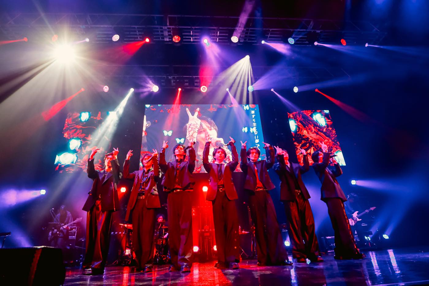 また「ダイヤモンドリリー」では、美しいピアノ演奏だけをバックに歌うという実験も。雪が舞うような照明効果とスポットライトを受け、左右一列に並んだ7人は、スタンドマイクで歌いつなぎ、冬の恋景色を切なく描き出していく。そこから流麗な鍵盤音が流れて小泉が「幽かな夜の夢」を歌い始めると、躍動的なバンド演奏が弾け、間奏ではエレキギターソロも炸裂。その熱に煽られ、7人のダンスもエモーショナルの度合を上げるばかりだ。スイングのリズムが心地良い「Paradox Re:Write」も、エレクトロな打ち込みの代わりにヘヴィなドラムとランニングベースが牽引するバンド演奏が入ることによって、軽快でエネルギッシュなジャズへと変貌。退廃とアンニュイ、そして激情の色を増した7人のスリリングなパフォーマンスは、さらに、メンバー同士が絡んで指を噛む「Mania」でダークに堕ちて危険な熱情を振りまいていく。最後は「ビネットネット」に「パラノイドランデブー」と、10月にリリースされた最新シングル「パラノイドランデブー」の収録曲で本編を締めくくり。艶めかしいボーカルとシンクロ率の高い緻密なダンスで醸す大人の色気は、ローの利いたバンド演奏とも相性抜群で、汗をにじませた表情でも普段のライブとは一味違う生々しさを感じさせた。夜公演の「因果応報アンチノミー」で大倉が叫んだように、これが新しい“原因は自分にある。”なのだろう。