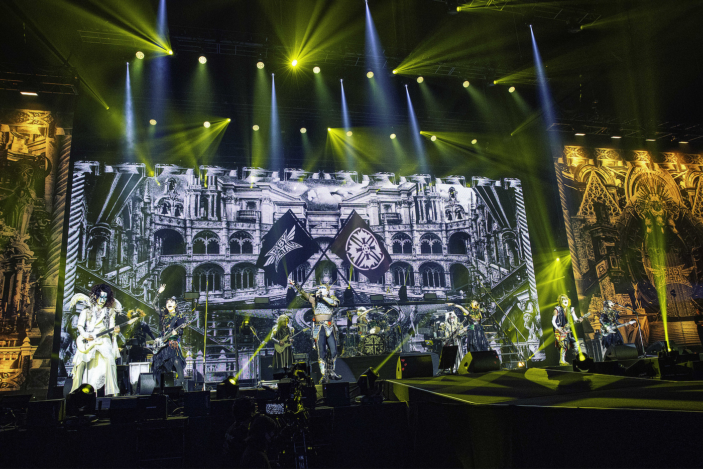 新譜大教典(=ニューアルバム)『Season II』のリードトラック「Kiss U Dead Or Alive」も素晴らしかった。偶数拍アクセントのギターリフが洋楽的で印象的なミドルテンポのハードロックに乗せて、生死を越えた究極の純愛が胸を打つ。戦いに挑み続け前進することを誓う「Next Is The Best!」も圧巻だった。火炎が噴射されるなか、この2日間が初披露という勢いに乗る王道メタルサウンドがKアリーナ横浜に響き渡った。ハイライトは黒魔術的な世界観を導入した「蝋人形の館」(※「蝋」は、旧字体が正式表記)だった。もはやHR/HMの枠を越えた大ヒット曲に、信者もTHE ONEも垣根を越えて大熱狂だ。