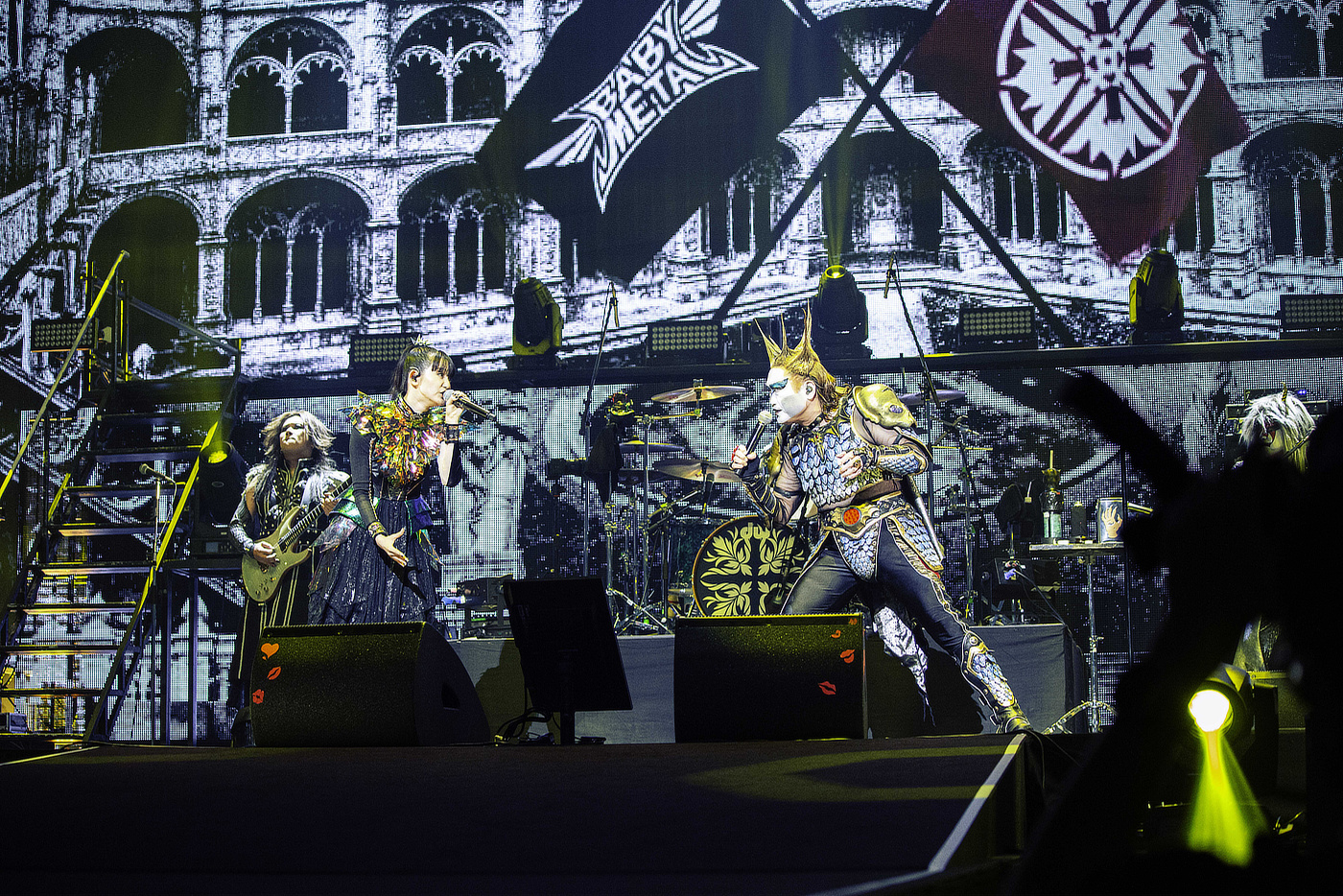 冒頭でダミアン陛下(聖飢魔IIの創始者・大魔王)とキツネ様(BABYMETALをメタルダンスユニットとして送り出したメタルの神様)が10万年ぶりに再会する様子がスクリーンに映し出される。急展開する状況下で登場したのはBABYMETALだ。自己紹介デスメタル「BABYMETAL DEATH」で火ぶたを切る。戦いに臨む3人の凛とした表情は、気高く美しい。「ヘドバンギャー!!」では、観衆がヘッドバンギングで強い思いを共有する。