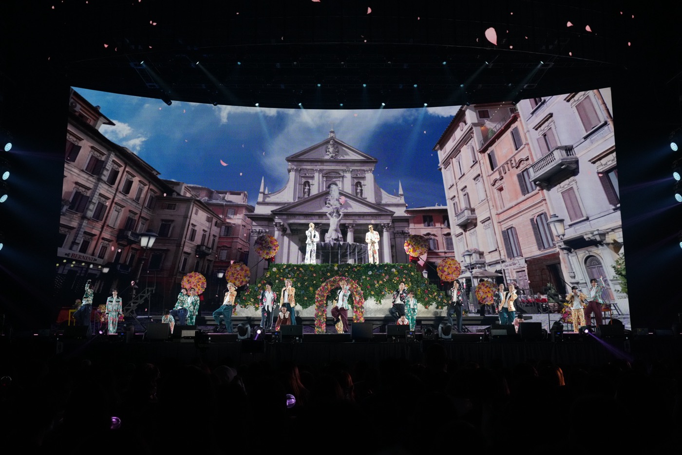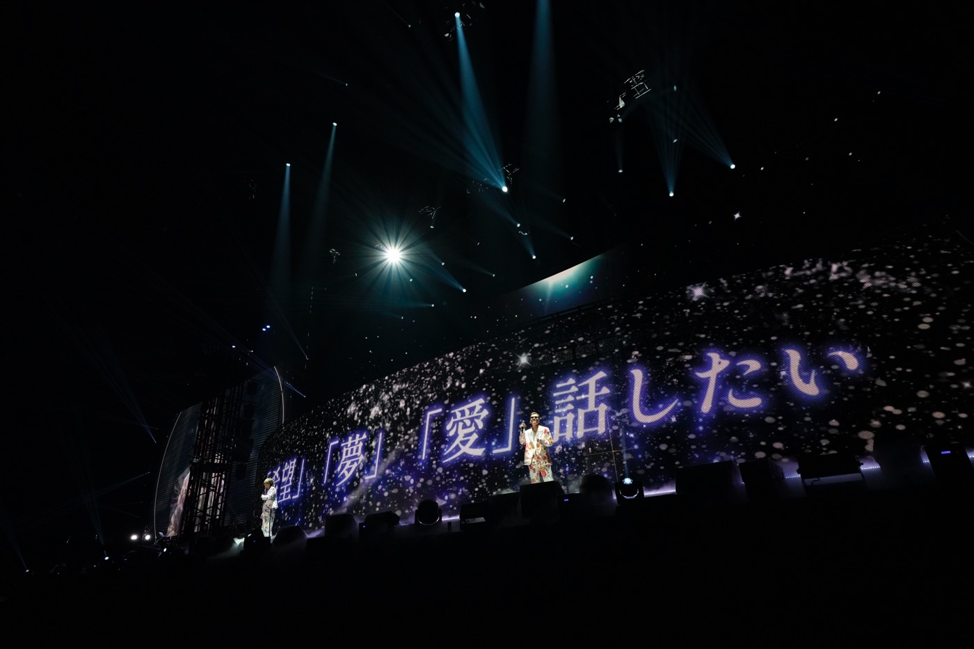 EXILE THE SECONDとJr.EXILE(STARTING MEMBER)のコラボや、LDHのDNAを色濃く受け継ぐTHE JET BOY BANGERZの存在が、“EXILEの未来”を象徴していたのに対し、次のブロックでは“EXILEの原点”を象徴する楽曲たちが続く。ストリングスの豊かな音色に導かれるようにライトアップすると、そこはまるでフラワーガーデン。色とりどりの花で飾られたオブジェを背にして、自らもブーケを手にしたATSUSHIとTAKAHIROが、少し照れ臭そうに寄り添いながらスタンバイしていた。ふたりが少女にブーケを手渡すと、花柄のセットアップに身を包んだEXILEとSTARTING MEMBERが続々と集まり、「Each Other’s Way ~旅の途中~」へ。ATSUSHIが「皆さんの心の中の美しい花が、いつまでも咲き続けていられますように」と言い添えたのは、「Flower Song」。「Lovers Again」「ふたつの唇」「Ti Amo」といった極上のラブバラードも“This is EXILE”と言うべき一面で、神谷や山本の芝居を交えた官能的なステージングが観客の視線を釘付けにしていた。「響 ~HIBIKI~」では、照明とダンスをリンクさせた美しい演出も。しなやかなダンスが彩った花道の先で、ATSUSHIとTAKAHIROはひたりにとって特別な思い入れのある「道」を大合唱し、会場に集った3万人の観客と思い出を重ねる。その光景は、恐らく、多くのEXILEファンが待ち望んでいたものだろう。もちろん、EXILE THE SECONDのメンバーや世界・佐藤も多くの功績を残しているのだが、短い静寂のあと、ATSUSHIからのメッセージとソロ曲「Just The Way You Are」が溢れ出すと、彼の誠実な歌声に“EXILEの原点”を強く実感したのだった。