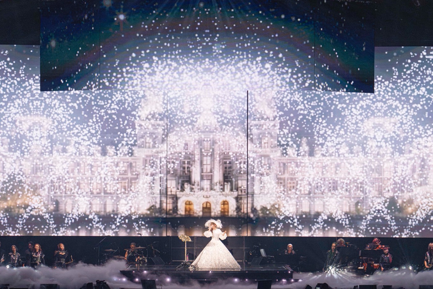 「私達はまだ間に合う こんな世の中でも この時代でも」というメッセージが映し出されたあと、大きな白く煌びやかなドレス姿でステージ中央に登場し、1曲目に披露されたのは中島みゆきの名曲「時代」。2024年3月にドラマ『万博の太陽』主題歌としてカバーし、話題となったこの名曲をライブ初披露。壮大なオーケストラアレンジと迫力の噴水ショーの映像を背に歌い上げた浜崎へ、会場からは割れんばかりの歓声が上がった。