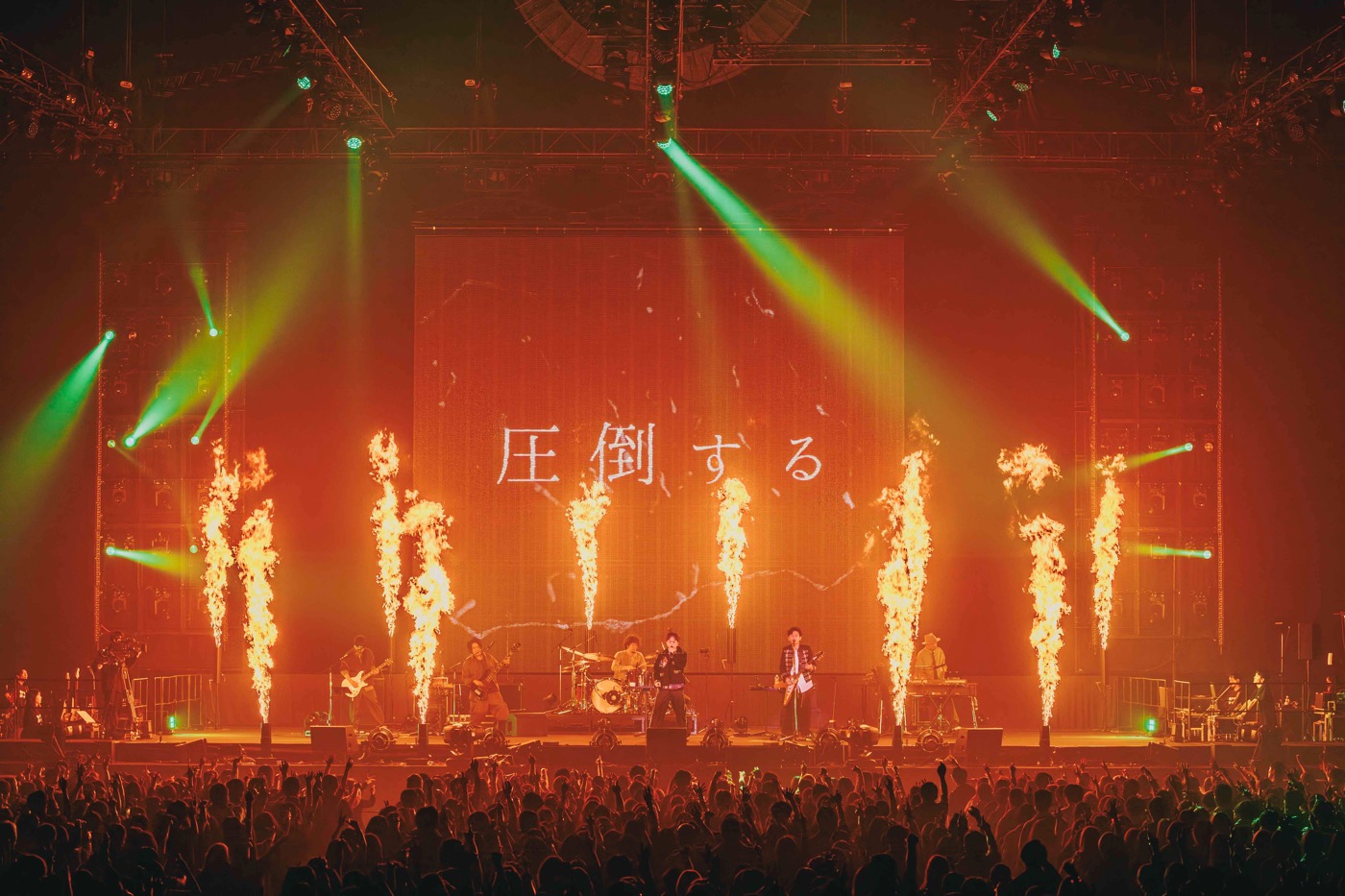 直木賞作家・今村翔吾の大ヒット小説『火喰鳥』が原作で、TVアニメ『火喰鳥 羽州ぼろ鳶組』のオープニングテーマとして詳細が発表された新曲「はみだし御免」をアンコール1曲目に披露し、早くも最新曲を塗り替え次なる光景を見せつける。