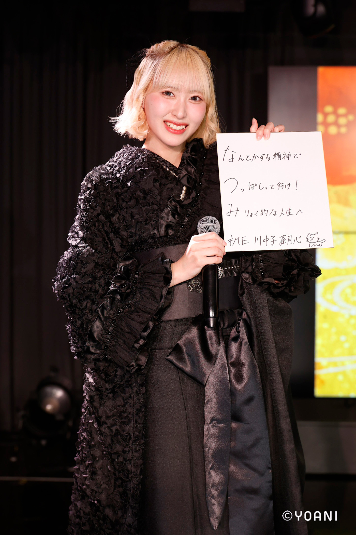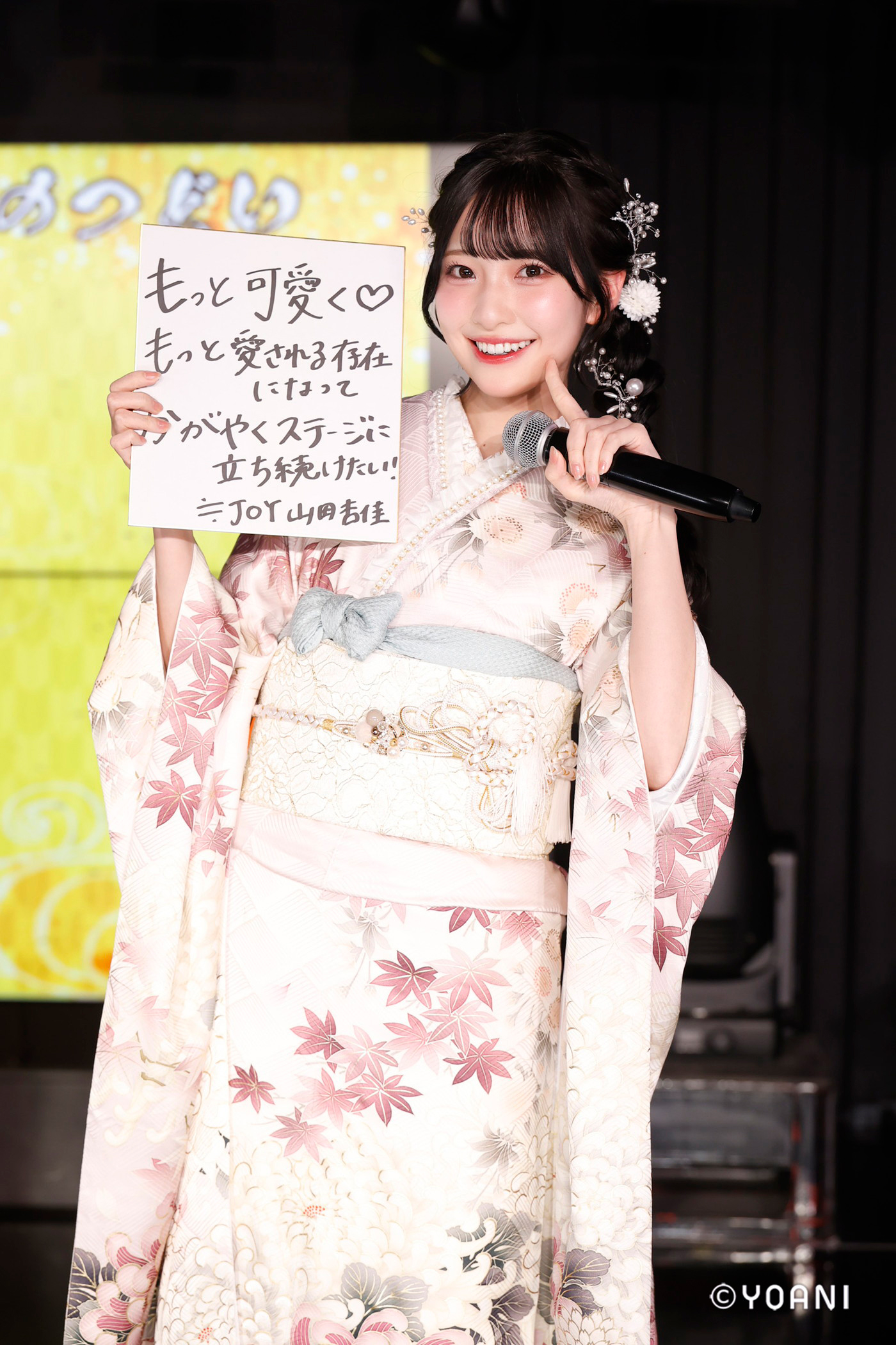 ≠MEのリーダー蟹沢萌子が立会人としてMCを務めたイベントでは、振袖姿の5名が二十歳の抱負を、自身の名前を頭文字にした「あいうえお作文」にして発表した。