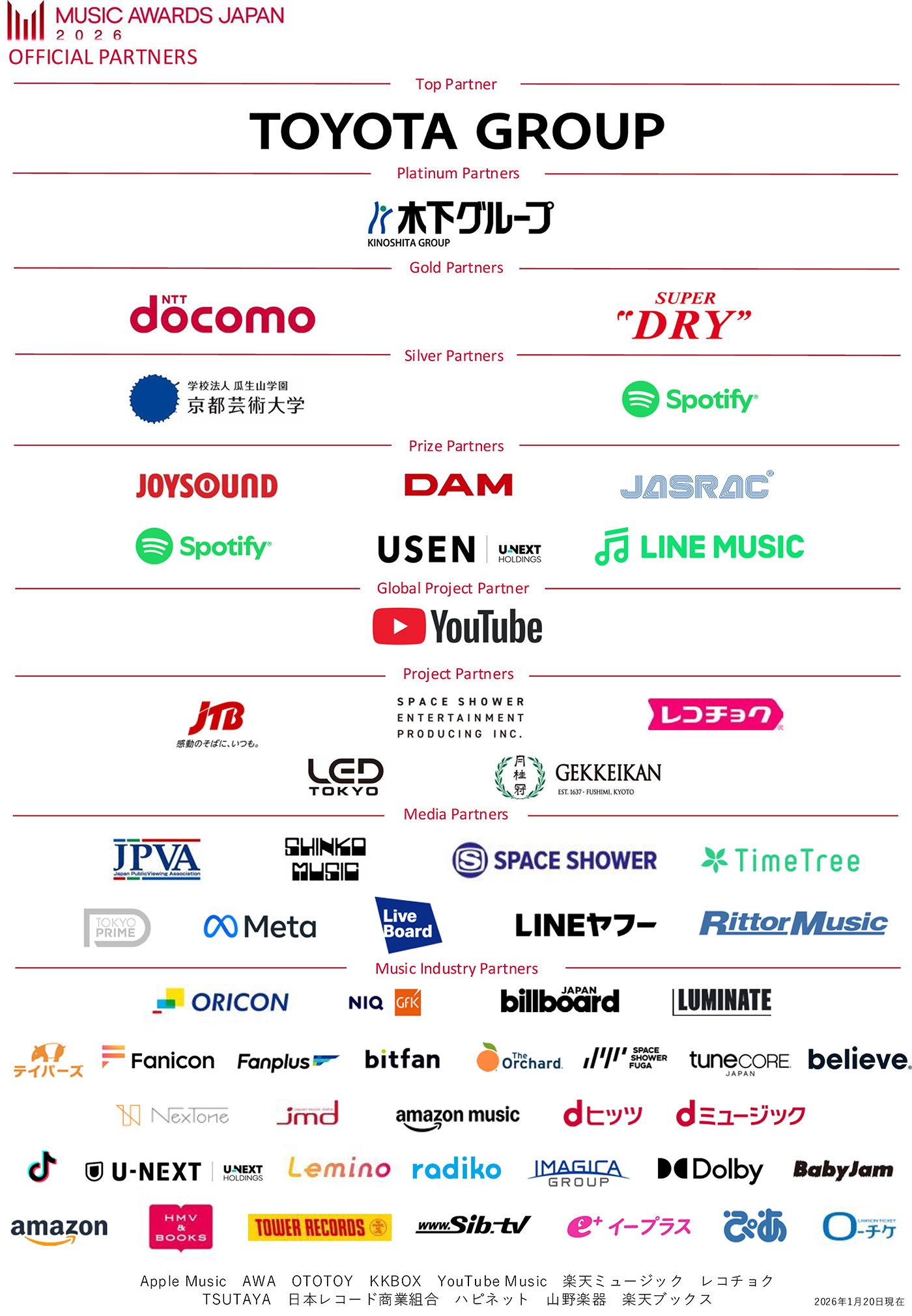 本アワード開催に当たり、数多くの企業がサポートすることが決定。トップパートナーには昨2025年に引き続きトヨタグループ、あらたに設定されたプラチナパートナーに株式会社木下グループ、ゴールドパートナーには株式会社NTTドコモ、アサヒビール株式会社、シルバーパートナーには、京都芸術大学(学校法人瓜生山学園)、スポティファイジャパン株式会社を迎える。