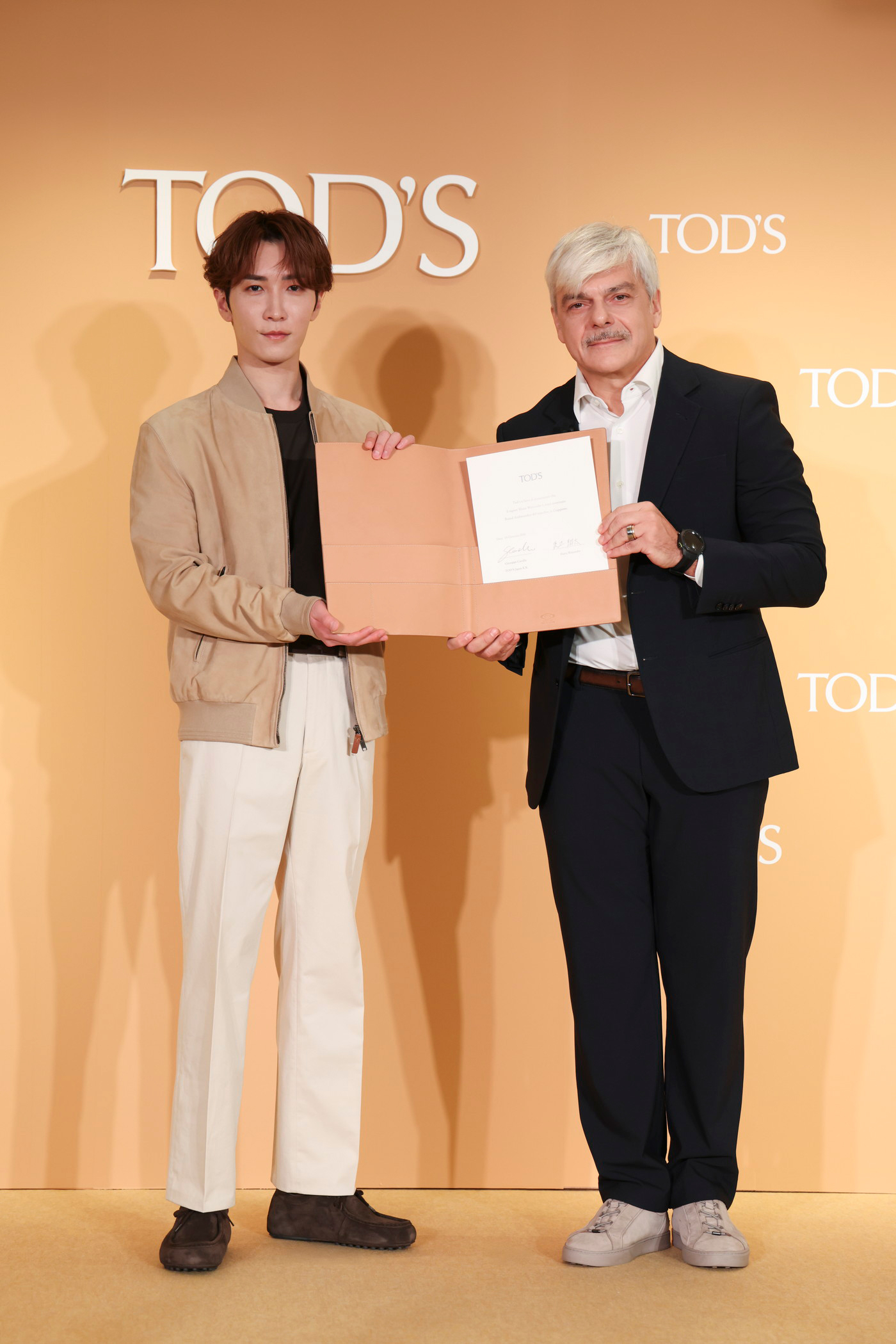 記者会見で渡辺はトッズ・ジャパン株式会社 代表取締役社長 ジュゼッペ・カヴァッロとともにブランド アンバサダー就任の任命証にサインをし、日本人男性初の快挙となるトッズ ブランド アンバサダーに就任。
