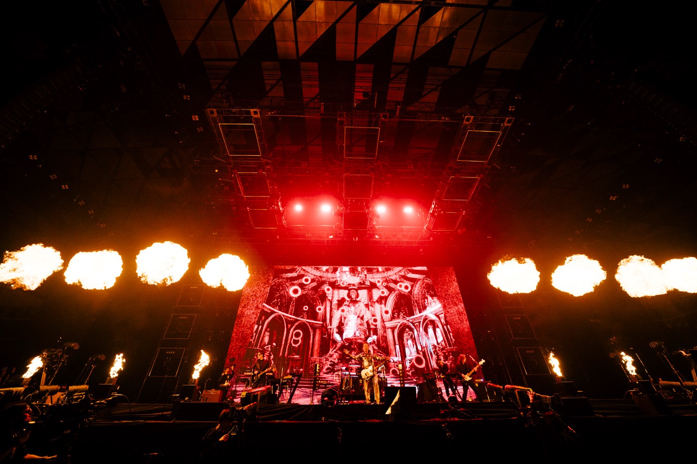 「君と肩寄せて眺めたオレンジ色の月」のフレーズに合わせるような、オレンジ色の世界が広がった「YOU」を優しく届けたかと思えば、禍々しい雰囲気からの「Paradox」、そして映画『キル・ビル』を想起させる黄色い殺気に満ちた情景が広がった「Battle Without Honor or Humanity」と続いた。サスティナーとアーミングを駆使し、威風堂々としながらもアバンギャルドな布袋のギタープレイに息を呑む。そこから布袋は王蟲の鳴き声のようなギターサウンドをけたたましく鳴らす。そうした得体の知れない余韻からフィードバックノイズが呼び寄せるように始まったのは、まさかの「DEVIL’S SUGAR」だ。久しぶりのライブ披露に客席からどよめきのような声があがる。さらに古くからのファンを喜ばせたのは原曲キーだったことだ。布袋のニヒルな歌声と、スリリングでトリッキーなギターソロが会場内いっぱい、邪悪に轟く。いにしえの悪魔を彷彿とさせる映像とステージ上で噴きあがる6本の火柱…退廃的な演出が楽曲の世界観を色濃くした。