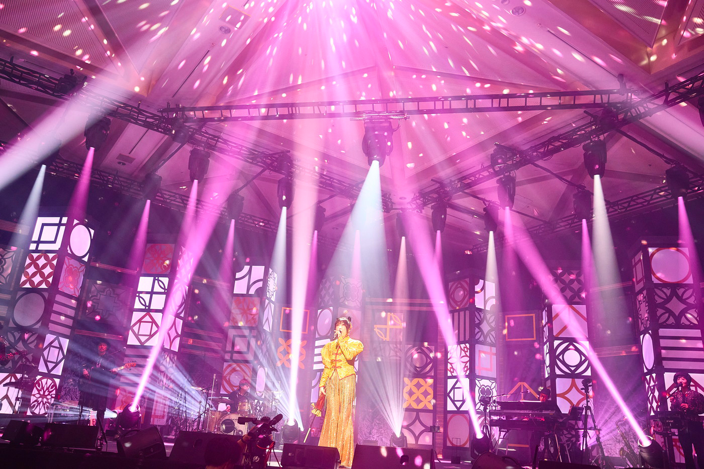 オープニングを飾ったのは「Misty Chaina Town」。きらびやかなゴールドのチャイニーズドレスを纏って登場したユーミン、異国情緒と物語性が交錯する世界観を会場全体に提示した。