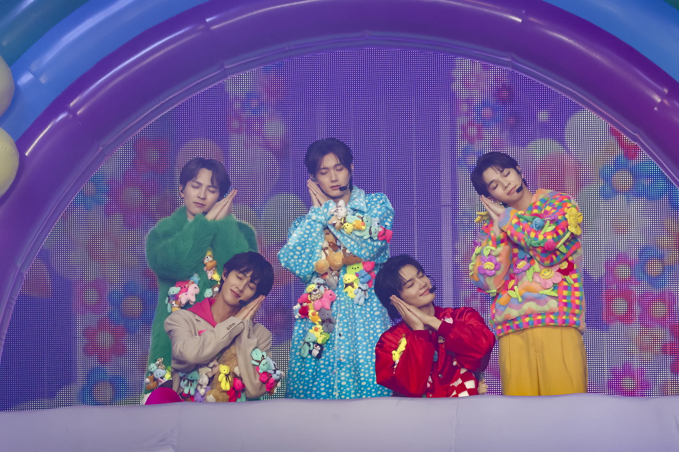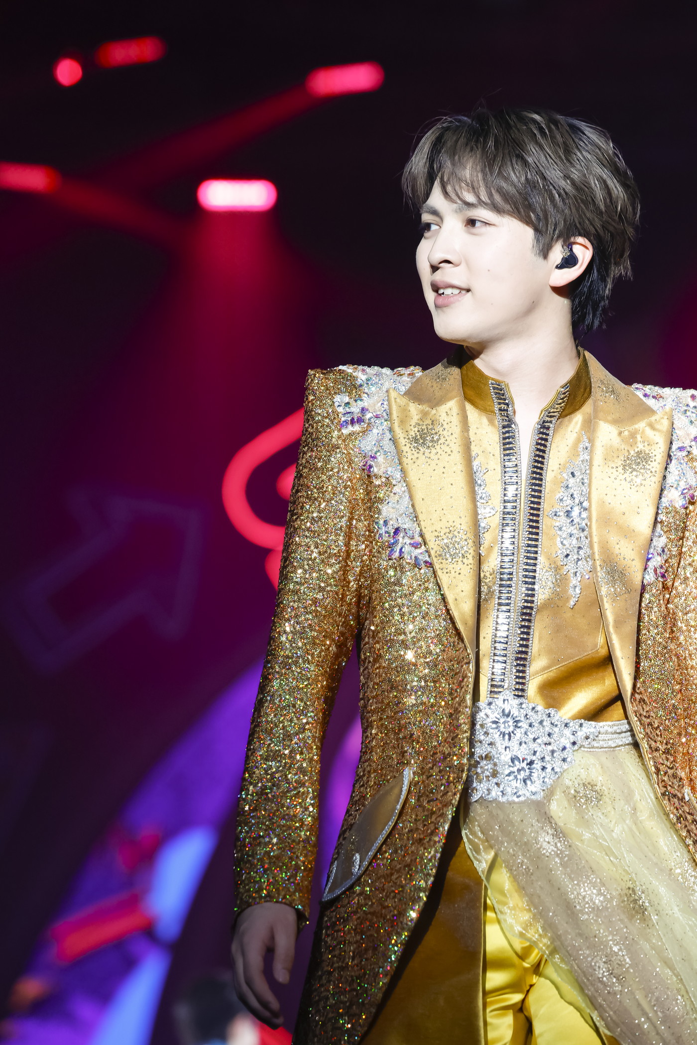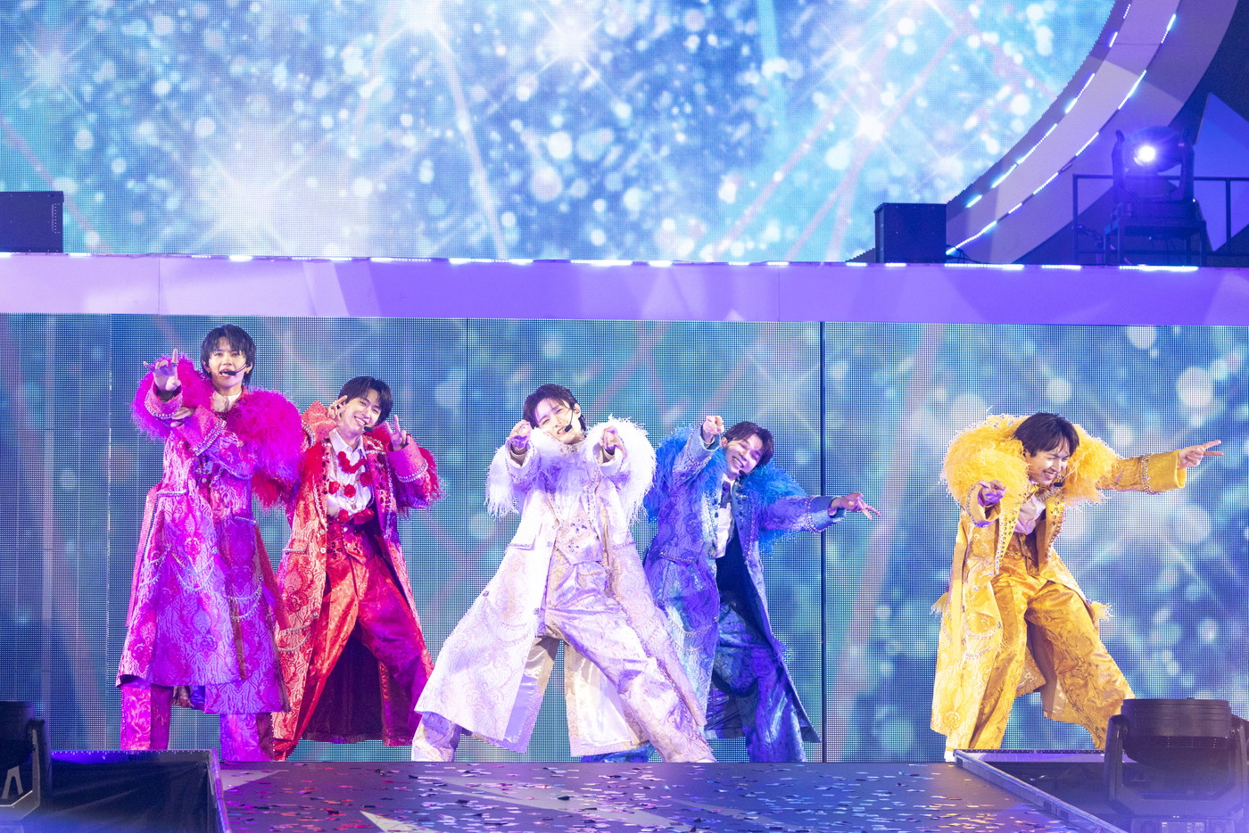 明るく楽しい“POP”から大人の色気が漂う“SEXY”へ。吉田と山中がクールな眼鏡をかけ、スタイリッシュなスーツ姿で踊ったラテン調の「labyrinth」では、スクリーンに映し出されたシルエットの女性とシンクロしたペアダンスも展開し、エレクトロR&B「energy」では、椅子を使ったしなやかなジャズダンスで観客を魅了。ここで雰囲気を一変させ、曽野の「ハッピー・バレンタイン! みんなの近くに行っちゃうよ」という言葉から始まった「男子スイーツ部発足します」で風船や電飾でデコレートされたトロッコに乗り込むと、アリーナを回って、笑顔で手を振りながら観客との距離を一気に縮め、「エビバディグッジョブ!」では、“カツオ節”や“小松菜”、“マウスウォッシュ”といった佐野が考案した複雑でユニークなコールで一体感を高めると、メインステージに戻ったメンバーはスタンドマイクを前に、ロングヒットを記録している「好きすぎて滅!」を全力でエネルギッシュにパフォーマンスし、待ちに待っていた観客を熱狂させた。