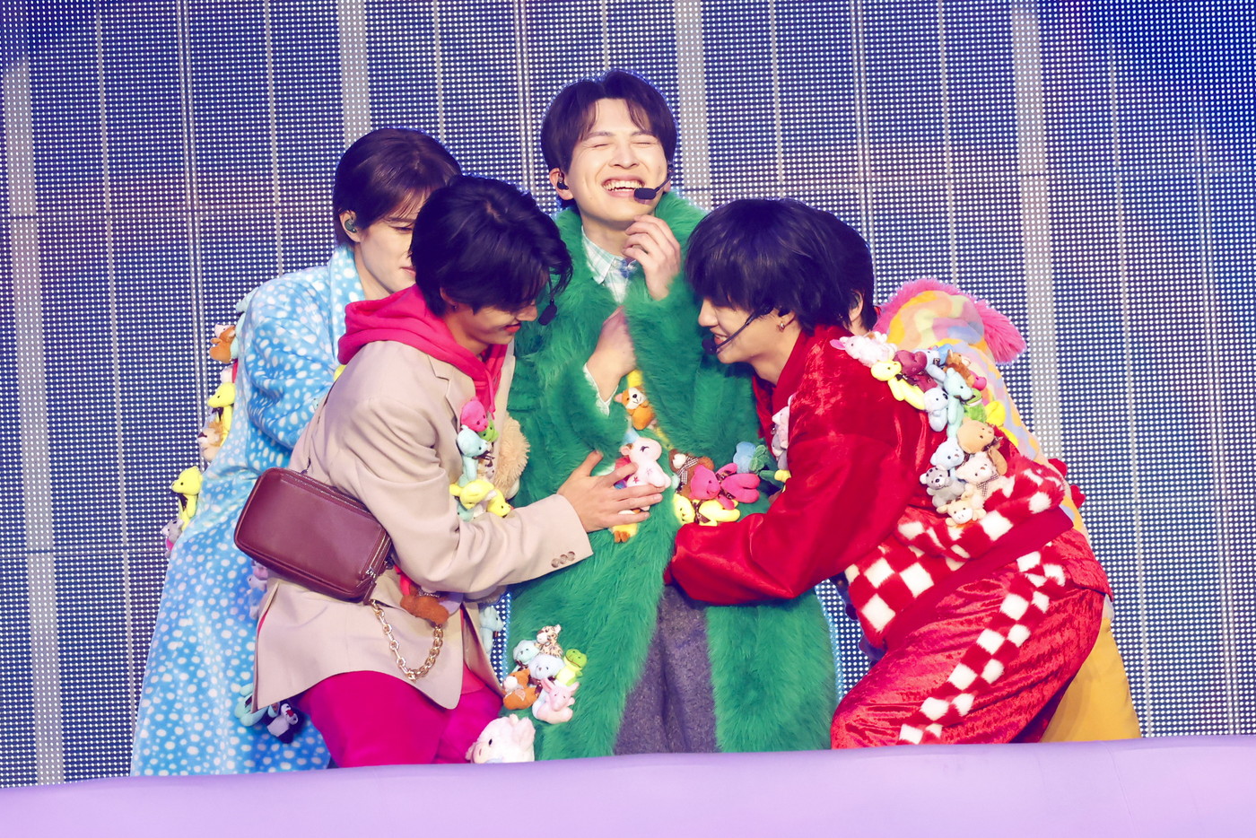 さらに、メインステージにはいつの間にかバルーンの巨大滑り台が出現。吉田の「オレが好きなんでしょ?」というセリフに歓声が上がったキュートでチャーミングなラブソング「チラチLOVE」を経て、「シアワシェイク」では滑り台を勢いよく滑ってはしゃぎ、ステージ横に設置されたブランコに笑顔で揺られるシーンもあった。佐野、塩崎、曽野による「We’re Here!!」では、映像に合わせてペンライトを会場中が同じ色に染めるというアクティビティのような遊びもあり、メンバーと一緒にテーマパークで楽しんでいるようなブロックとなった。