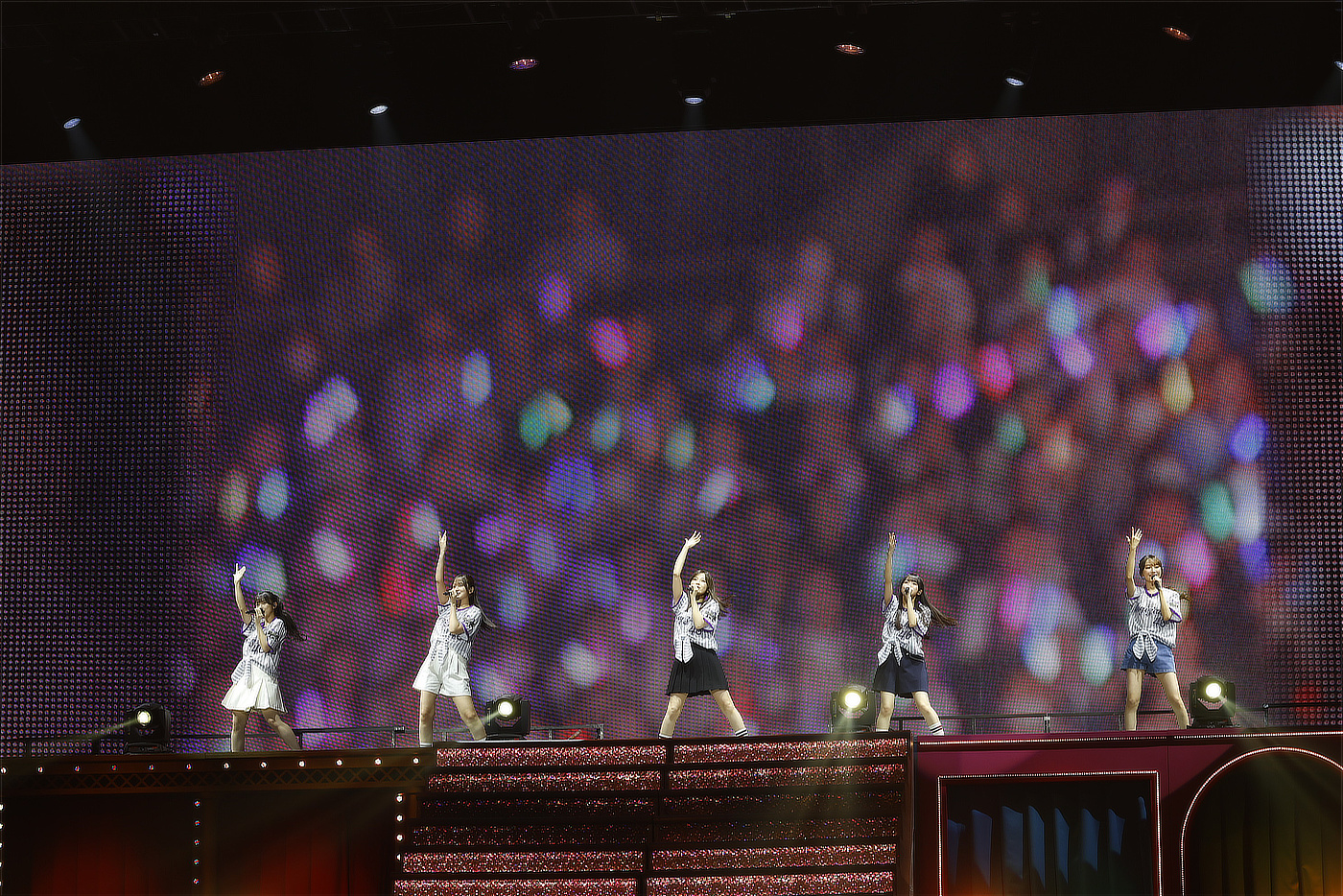その後、ステージに残った田村、池田、一ノ瀬美空のもとに猫の姿をした小川と菅原咲月が加わり、ショートコントが繰り広げられる。そして、小川と菅原が語尾に「にゃん」を付けたセリフで場を盛り上げるなか、猫の衣装に変わった田村、池田、一ノ瀬が再登場すると、そのままロックテイストの「懐かない仔猫」へ突入し、場の熱気をさらに高めることに。さらに、田村と一ノ瀬のほか、井上や岩本、吉田綾乃クリスティーが合流して「君と猫」が披露されると、オーディエンスは歓喜の声を上げた。