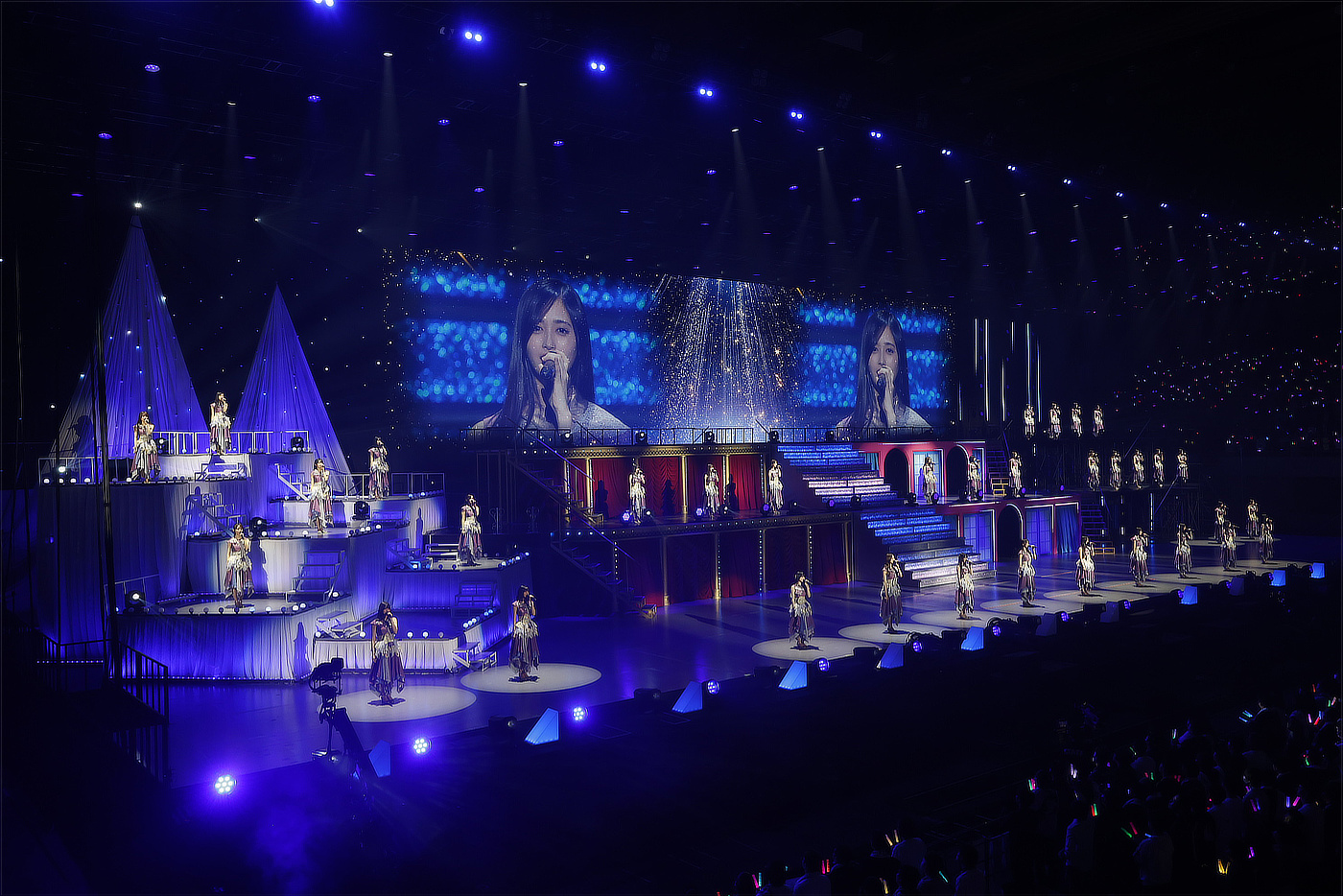 続いて、ステージ下手に伊藤理々杏、岩本蓮加、賀喜、田村真佑、池田瑛紗、井上和が白いドレス姿で姿を現し「あの光」を伸びやかな歌声で表現。対して下手側には、紺色の衣装を着た黒見明香、筒井、弓木奈於、五百城、川崎桜(「崎」は、たつさきが正式表記)が登場し、リズミカルなフレーズが印象的な「君にDitto」で空気を一変させる。また、小川彩をセンターに迎えた「命の冒涜」では、水色の衣装を着用した4~6期メンバーが爽やかなトラックにエモーショナルな歌声を重ね、「パッションフルーツの食べ方」では梅澤や遠藤、五百城、矢田萌華が赤いスタイリッシュな衣装で艶やかなボーカルを響かせる。かと思えば、田村をはじめとするメンバーは耳&しっぽを付けた“たぬきファッション”でぼ「ぶんぶくちゃがま」で、可愛らしさに特化したパフォーマンスを披露。カップリング曲中心とあってか、いつも以上に緩急の激しいバラエティに富んだライブが展開されていく。