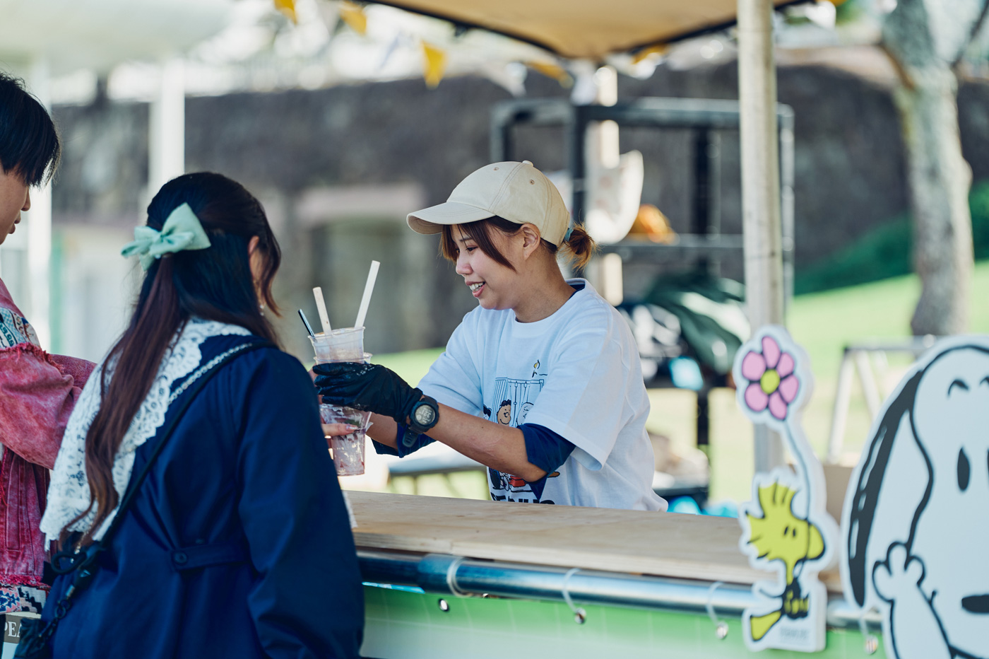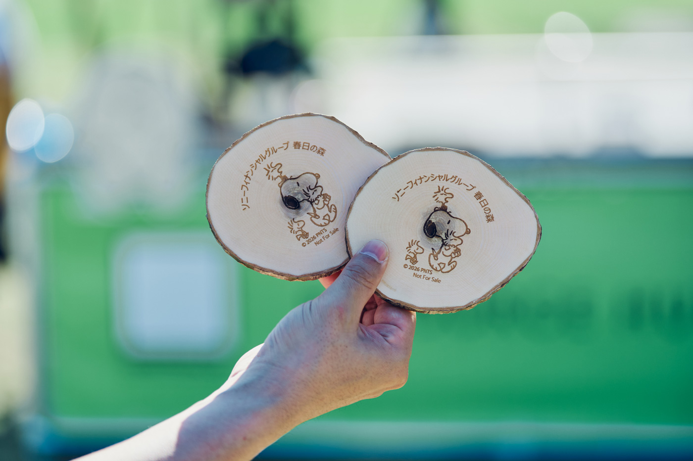 リソースハブのテント内や周囲には、スヌーピーのイラストやピーナッツコミックの名場面が散りばめられ、資源回収に協力してくれた来場者にはスヌーピーのステッカーや間伐材を活用したコースターの配布が行われていた。