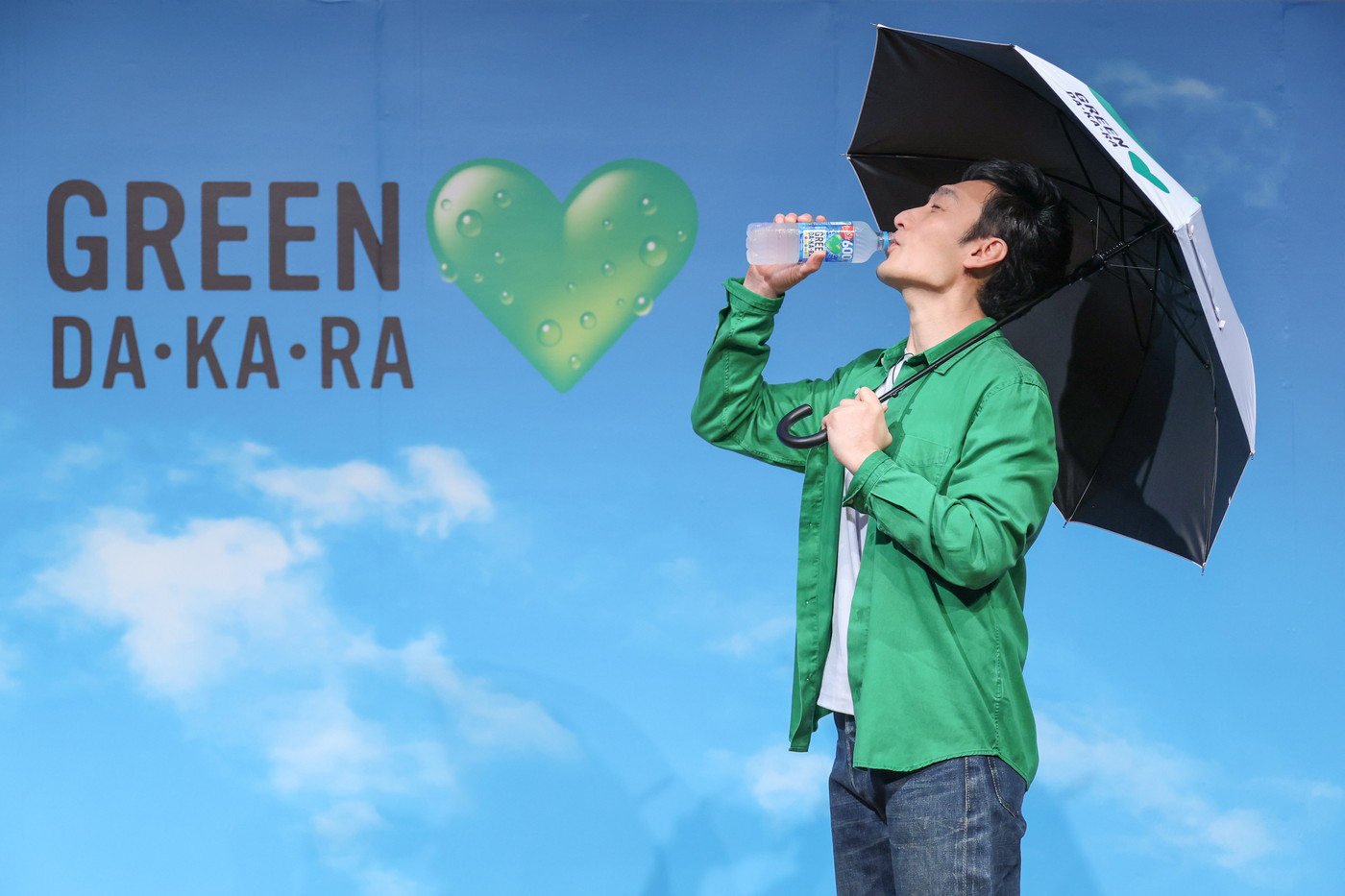 日傘を差しながら登場した草なぎは、「かわいいでしょ? 僕もかわいいですか?」と問いかけ、会場の笑いを誘った。さらに、冷えた“GREEN DA・KA・RA”を口にすると、「うるおう~! 今年は猛暑日を飛び越えて酷暑日なので、水分補給は大事です」とコメント。そして、「油断ならないのでもう一口…うるおう~!」と笑顔を見せ、草なぎらしい飾らないコメントで場を和ませた。