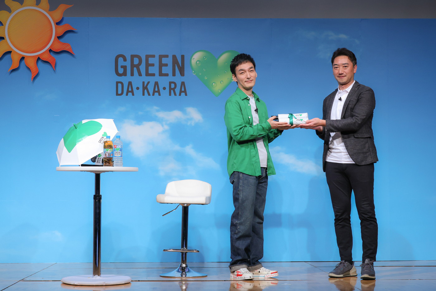 これを受けて、サントリーからあらたな取り組み「おやこひがさ大作戦!」で提供される“GREEN DA・KA・RA”オリジナルの日傘がサプライズで贈呈されると、「ちょうどいい! 新しい地図のふたりにも渡したいと思います! おしゃれで、『ヤツ(酷暑)』を防ぐには心強い。日傘を持って、水分補給をして、夏を楽しみたいと思います!」と笑顔で喜びの気持ちを表した。